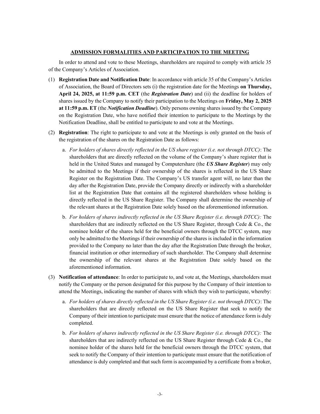 -3- ADMISSION FORMALITIES AND PARTICIPATION TO THE MEETING In order to attend and vote to these Meetings, shareholders are required to comply with article 35 of the Company’s Articles of Association. (1) Registration Date and Notification Date: In accordance with article 35 of the Company’s Articles of Association, the Board of Directors sets (i) the registration date for the Meetings on Thursday, April 24, 2025, at 11:59 p.m. CET (the Registration Date) and (ii) the deadline for holders of shares issued by the Company to notify their participation to the Meetings on Friday, May 2, 2025 at 11:59 p.m. ET (the Notification Deadline). Only persons owning shares issued by the Company on the Registration Date, who have notified their intention to participate to the Meetings by the Notification Deadline, shall be entitled to participate to and vote at the Meetings. (2) Registration: The right to participate to and vote at the Meetings is only granted on the basis of the registration of the shares on the Registration Date as follows: a. For holders of shares directly reflected in the US share register (i.e. not through DTCC): The shareholders that are directly reflected on the volume of the Company’s share register that is held in the United States and managed by Computershare (the US Share Register) may only be admitted to the Meetings if their ownership of the shares is reflected in the US Share Register on the Registration Date. The Company’s US transfer agent will, no later than the day after the Registration Date, provide the Company directly or indirectly with a shareholder list at the Registration Date that contains all the registered shareholders whose holding is directly reflected in the US Share Register. The Company shall determine the ownership of the relevant shares at the Registration Date solely based on the aforementioned information. b. For holders of shares indirectly reflected in the US Share Register (i.e. through DTCC): The shareholders that are indirectly reflected on the US Share Register, through Cede & Co., the nominee holder of the shares held for the beneficial owners through the DTCC system, may only be admitted to the Meetings if their ownership of the shares is included in the information provided to the Company no later than the day after the Registration Date through the broker, financial institution or other intermediary of such shareholder. The Company shall determine the ownership of the relevant shares at the Registration Date solely based on the aforementioned information. (3) Notification of attendance: In order to participate to, and vote at, the Meetings, shareholders must notify the Company or the person designated for this purpose by the Company of their intention to attend the Meetings, indicating the number of shares with which they wish to participate, whereby: a. For holders of shares directly reflected in the US Share Register (i.e. not through DTCC): The shareholders that are directly reflected on the US Share Register that seek to notify the Company of their intention to participate must ensure that the notice of attendance form is duly completed. b. For holders of shares indirectly reflected in the US Share Register (i.e. through DTCC): The shareholders that are indirectly reflected on the US Share Register through Cede & Co., the nominee holder of the shares held for the beneficial owners through the DTCC system, that seek to notify the Company of their intention to participate must ensure that the notification of attendance is duly completed and that such form is accompanied by a certificate from a broker,
