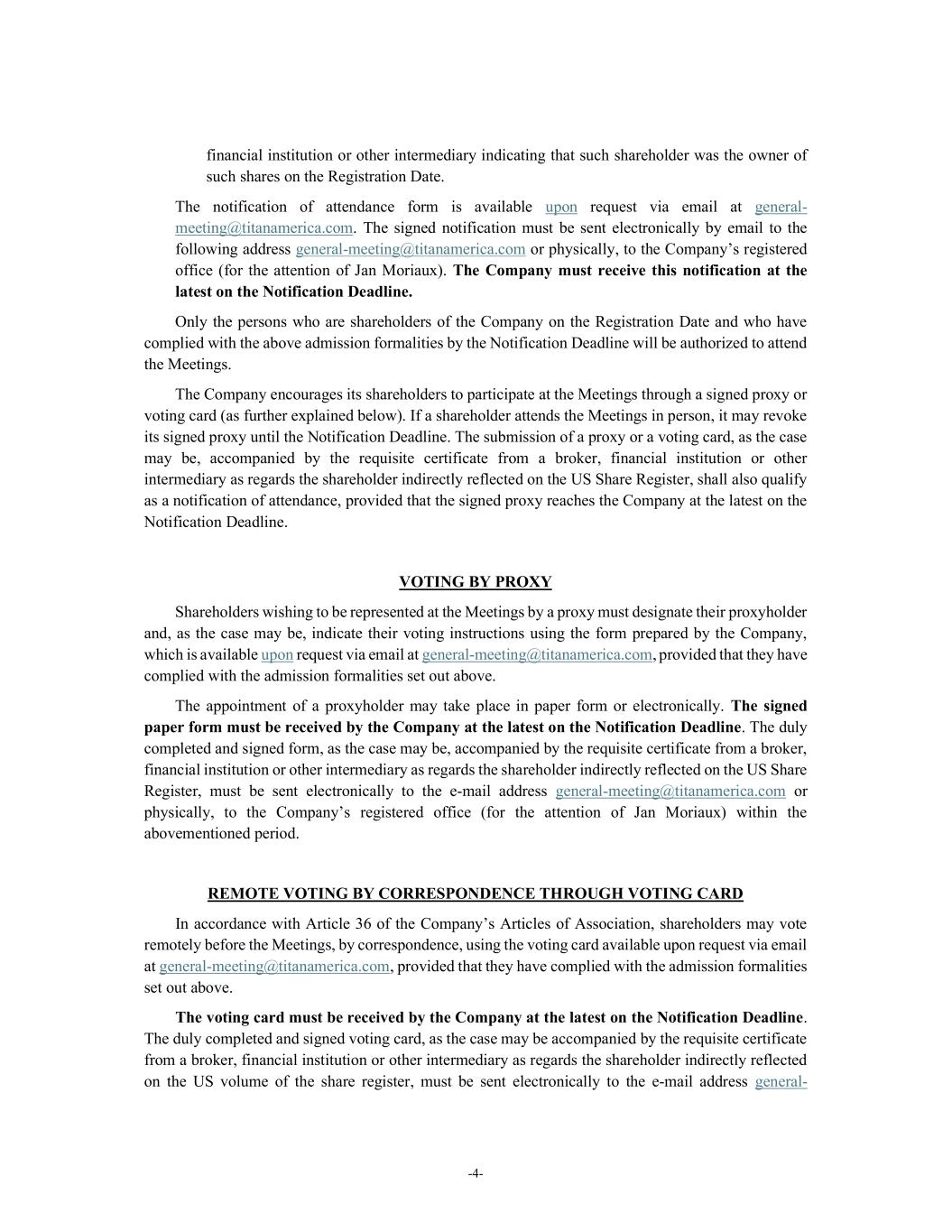 -4- financial institution or other intermediary indicating that such shareholder was the owner of such shares on the Registration Date. The notification of attendance form is available upon request via email at general- meeting@titanamerica.com. The signed notification must be sent electronically by email to the following address general-meeting@titanamerica.com or physically, to the Company’s registered office (for the attention of Jan Moriaux). The Company must receive this notification at the latest on the Notification Deadline. Only the persons who are shareholders of the Company on the Registration Date and who have complied with the above admission formalities by the Notification Deadline will be authorized to attend the Meetings. The Company encourages its shareholders to participate at the Meetings through a signed proxy or voting card (as further explained below). If a shareholder attends the Meetings in person, it may revoke its signed proxy until the Notification Deadline. The submission of a proxy or a voting card, as the case may be, accompanied by the requisite certificate from a broker, financial institution or other intermediary as regards the shareholder indirectly reflected on the US Share Register, shall also qualify as a notification of attendance, provided that the signed proxy reaches the Company at the latest on the Notification Deadline. VOTING BY PROXY Shareholders wishing to be represented at the Meetings by a proxy must designate their proxyholder and, as the case may be, indicate their voting instructions using the form prepared by the Company, which is available upon request via email at general-meeting@titanamerica.com, provided that they have complied with the admission formalities set out above. The appointment of a proxyholder may take place in paper form or electronically. The signed paper form must be received by the Company at the latest on the Notification Deadline. The duly completed and signed form, as the case may be, accompanied by the requisite certificate from a broker, financial institution or other intermediary as regards the shareholder indirectly reflected on the US Share Register, must be sent electronically to the e-mail address general-meeting@titanamerica.com or physically, to the Company’s registered office (for the attention of Jan Moriaux) within the abovementioned period. REMOTE VOTING BY CORRESPONDENCE THROUGH VOTING CARD In accordance with Article 36 of the Company’s Articles of Association, shareholders may vote remotely before the Meetings, by correspondence, using the voting card available upon request via email at general-meeting@titanamerica.com, provided that they have complied with the admission formalities set out above. The voting card must be received by the Company at the latest on the Notification Deadline. The duly completed and signed voting card, as the case may be accompanied by the requisite certificate from a broker, financial institution or other intermediary as regards the shareholder indirectly reflected on the US volume of the share register, must be sent electronically to the e-mail address general-