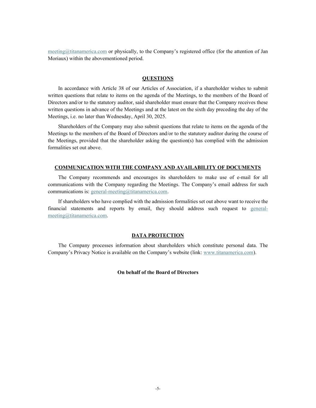 -5- meeting@titanamerica.com or physically, to the Company’s registered office (for the attention of Jan Moriaux) within the abovementioned period. QUESTIONS In accordance with Article 38 of our Articles of Association, if a shareholder wishes to submit written questions that relate to items on the agenda of the Meetings, to the members of the Board of Directors and/or to the statutory auditor, said shareholder must ensure that the Company receives these written questions in advance of the Meetings and at the latest on the sixth day preceding the day of the Meetings, i.e. no later than Wednesday, April 30, 2025. Shareholders of the Company may also submit questions that relate to items on the agenda of the Meetings to the members of the Board of Directors and/or to the statutory auditor during the course of the Meetings, provided that the shareholder asking the question(s) has complied with the admission formalities set out above. COMMUNICATION WITH THE COMPANY AND AVAILABILITY OF DOCUMENTS The Company recommends and encourages its shareholders to make use of e-mail for all communications with the Company regarding the Meetings. The Company’s email address for such communications is: general-meeting@titanamerica.com. If shareholders who have complied with the admission formalities set out above want to receive the financial statements and reports by email, they should address such request to general- meeting@titanamerica.com. DATA PROTECTION The Company processes information about shareholders which constitute personal data. The Company’s Privacy Notice is available on the Company’s website (link: www.titanamerica.com). On behalf of the Board of Directors