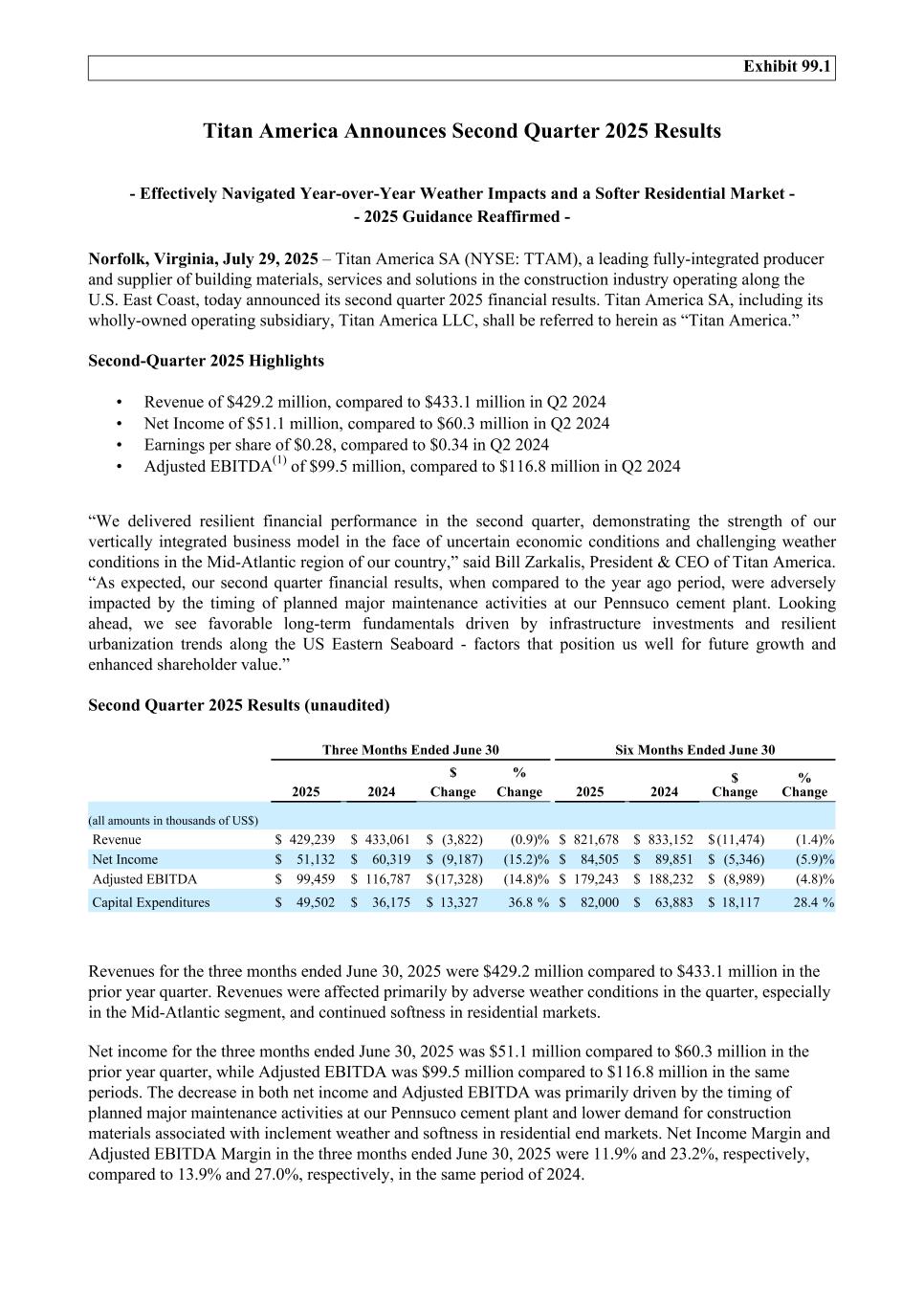 Titan America Announces Second Quarter 2025 Results - Effectively Navigated Year-over-Year Weather Impacts and a Softer Residential Market - - 2025 Guidance Reaffirmed - Norfolk, Virginia, July 29, 2025 – Titan America SA (NYSE: TTAM), a leading fully-integrated producer and supplier of building materials, services and solutions in the construction industry operating along the U.S. East Coast, today announced its second quarter 2025 financial results. Titan America SA, including its wholly-owned operating subsidiary, Titan America LLC, shall be referred to herein as “Titan America.” Second-Quarter 2025 Highlights • Revenue of $429.2 million, compared to $433.1 million in Q2 2024 • Net Income of $51.1 million, compared to $60.3 million in Q2 2024 • Earnings per share of $0.28, compared to $0.34 in Q2 2024 • Adjusted EBITDA(1) of $99.5 million, compared to $116.8 million in Q2 2024 “We delivered resilient financial performance in the second quarter, demonstrating the strength of our vertically integrated business model in the face of uncertain economic conditions and challenging weather conditions in the Mid-Atlantic region of our country,” said Bill Zarkalis, President & CEO of Titan America. “As expected, our second quarter financial results, when compared to the year ago period, were adversely impacted by the timing of planned major maintenance activities at our Pennsuco cement plant. Looking ahead, we see favorable long-term fundamentals driven by infrastructure investments and resilient urbanization trends along the US Eastern Seaboard - factors that position us well for future growth and enhanced shareholder value.” Second Quarter 2025 Results (unaudited) Three Months Ended June 30 Six Months Ended June 30 2025 2024 $ Change % Change 2025 2024 $ Change % Change (all amounts in thousands of US$) Revenue $ 429,239 $ 433,061 $ (3,822) (0.9) % $ 821,678 $ 833,152 $ (11,474) (1.4) % Net Income $ 51,132 $ 60,319 $ (9,187) (15.2) % $ 84,505 $ 89,851 $ (5,346) (5.9) % Adjusted EBITDA $ 99,459 $ 116,787 $ (17,328) (14.8) % $ 179,243 $ 188,232 $ (8,989) (4.8) % Capital Expenditures $ 49,502 $ 36,175 $ 13,327 36.8 % $ 82,000 $ 63,883 $ 18,117 28.4 % Revenues for the three months ended June 30, 2025 were $429.2 million compared to $433.1 million in the prior year quarter. Revenues were affected primarily by adverse weather conditions in the quarter, especially in the Mid-Atlantic segment, and continued softness in residential markets. Net income for the three months ended June 30, 2025 was $51.1 million compared to $60.3 million in the prior year quarter, while Adjusted EBITDA was $99.5 million compared to $116.8 million in the same periods. The decrease in both net income and Adjusted EBITDA was primarily driven by the timing of planned major maintenance activities at our Pennsuco cement plant and lower demand for construction materials associated with inclement weather and softness in residential end markets. Net Income Margin and Adjusted EBITDA Margin in the three months ended June 30, 2025 were 11.9% and 23.2%, respectively, compared to 13.9% and 27.0%, respectively, in the same period of 2024. Exhibit 99.1