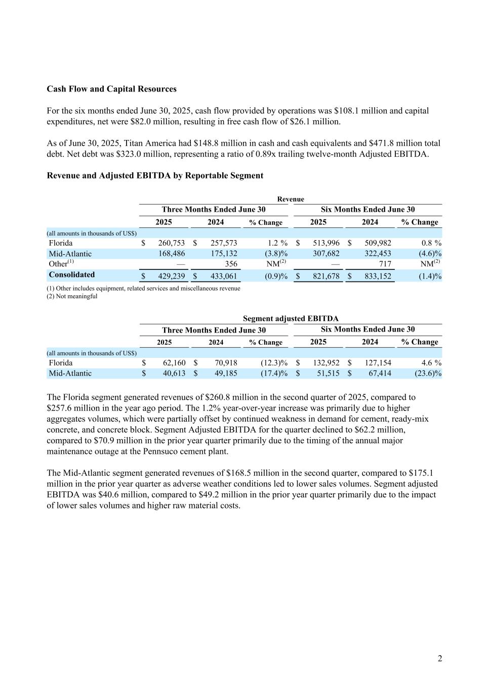 Cash Flow and Capital Resources For the six months ended June 30, 2025, cash flow provided by operations was $108.1 million and capital expenditures, net were $82.0 million, resulting in free cash flow of $26.1 million. As of June 30, 2025, Titan America had $148.8 million in cash and cash equivalents and $471.8 million total debt. Net debt was $323.0 million, representing a ratio of 0.89x trailing twelve-month Adjusted EBITDA. Revenue and Adjusted EBITDA by Reportable Segment Revenue Three Months Ended June 30 Six Months Ended June 30 2025 2024 % Change 2025 2024 % Change (all amounts in thousands of US$) Florida $ 260,753 $ 257,573 1.2 % $ 513,996 $ 509,982 0.8 % Mid-Atlantic 168,486 175,132 (3.8) % 307,682 322,453 (4.6) % Other(1) — 356 NM(2) — 717 NM(2) Consolidated $ 429,239 $ 433,061 (0.9) % $ 821,678 $ 833,152 (1.4) % (1) Other includes equipment, related services and miscellaneous revenue (2) Not meaningful Segment adjusted EBITDA Three Months Ended June 30 Six Months Ended June 30 2025 2024 % Change 2025 2024 % Change (all amounts in thousands of US$) Florida $ 62,160 $ 70,918 (12.3) % $ 132,952 $ 127,154 4.6 % Mid-Atlantic $ 40,613 $ 49,185 (17.4) % $ 51,515 $ 67,414 (23.6) % The Florida segment generated revenues of $260.8 million in the second quarter of 2025, compared to $257.6 million in the year ago period. The 1.2% year-over-year increase was primarily due to higher aggregates volumes, which were partially offset by continued weakness in demand for cement, ready-mix concrete, and concrete block. Segment Adjusted EBITDA for the quarter declined to $62.2 million, compared to $70.9 million in the prior year quarter primarily due to the timing of the annual major maintenance outage at the Pennsuco cement plant. The Mid-Atlantic segment generated revenues of $168.5 million in the second quarter, compared to $175.1 million in the prior year quarter as adverse weather conditions led to lower sales volumes. Segment adjusted EBITDA was $40.6 million, compared to $49.2 million in the prior year quarter primarily due to the impact of lower sales volumes and higher raw material costs. 2