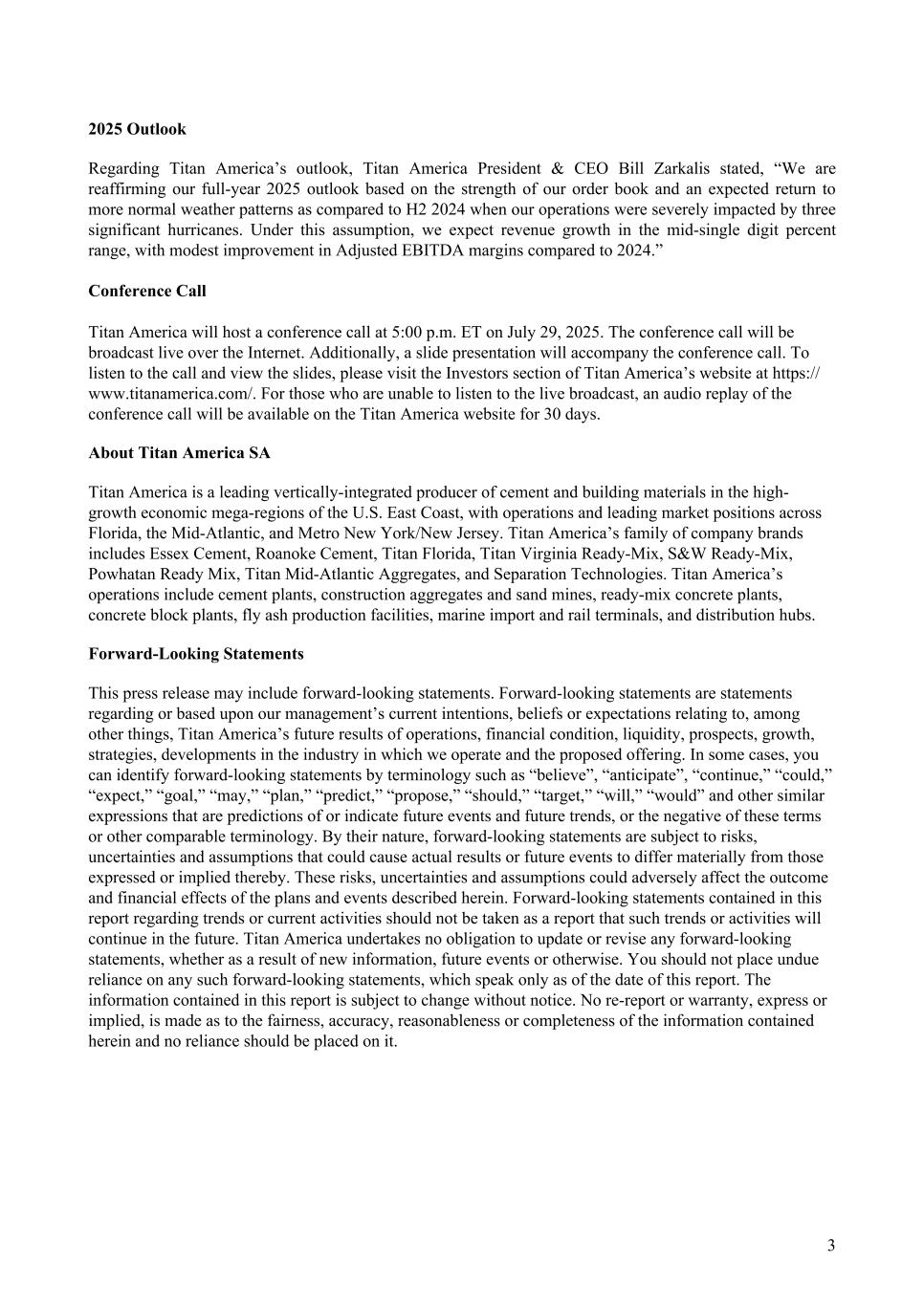 2025 Outlook Regarding Titan America’s outlook, Titan America President & CEO Bill Zarkalis stated, “We are reaffirming our full-year 2025 outlook based on the strength of our order book and an expected return to more normal weather patterns as compared to H2 2024 when our operations were severely impacted by three significant hurricanes. Under this assumption, we expect revenue growth in the mid-single digit percent range, with modest improvement in Adjusted EBITDA margins compared to 2024.” Conference Call Titan America will host a conference call at 5:00 p.m. ET on July 29, 2025. The conference call will be broadcast live over the Internet. Additionally, a slide presentation will accompany the conference call. To listen to the call and view the slides, please visit the Investors section of Titan America’s website at https:// www.titanamerica.com/. For those who are unable to listen to the live broadcast, an audio replay of the conference call will be available on the Titan America website for 30 days. About Titan America SA Titan America is a leading vertically-integrated producer of cement and building materials in the high- growth economic mega-regions of the U.S. East Coast, with operations and leading market positions across Florida, the Mid-Atlantic, and Metro New York/New Jersey. Titan America’s family of company brands includes Essex Cement, Roanoke Cement, Titan Florida, Titan Virginia Ready-Mix, S&W Ready-Mix, Powhatan Ready Mix, Titan Mid-Atlantic Aggregates, and Separation Technologies. Titan America’s operations include cement plants, construction aggregates and sand mines, ready-mix concrete plants, concrete block plants, fly ash production facilities, marine import and rail terminals, and distribution hubs. Forward-Looking Statements This press release may include forward-looking statements. Forward-looking statements are statements regarding or based upon our management’s current intentions, beliefs or expectations relating to, among other things, Titan America’s future results of operations, financial condition, liquidity, prospects, growth, strategies, developments in the industry in which we operate and the proposed offering. In some cases, you can identify forward-looking statements by terminology such as “believe”, “anticipate”, “continue,” “could,” “expect,” “goal,” “may,” “plan,” “predict,” “propose,” “should,” “target,” “will,” “would” and other similar expressions that are predictions of or indicate future events and future trends, or the negative of these terms or other comparable terminology. By their nature, forward-looking statements are subject to risks, uncertainties and assumptions that could cause actual results or future events to differ materially from those expressed or implied thereby. These risks, uncertainties and assumptions could adversely affect the outcome and financial effects of the plans and events described herein. Forward-looking statements contained in this report regarding trends or current activities should not be taken as a report that such trends or activities will continue in the future. Titan America undertakes no obligation to update or revise any forward-looking statements, whether as a result of new information, future events or otherwise. You should not place undue reliance on any such forward-looking statements, which speak only as of the date of this report. The information contained in this report is subject to change without notice. No re-report or warranty, express or implied, is made as to the fairness, accuracy, reasonableness or completeness of the information contained herein and no reliance should be placed on it. 3
