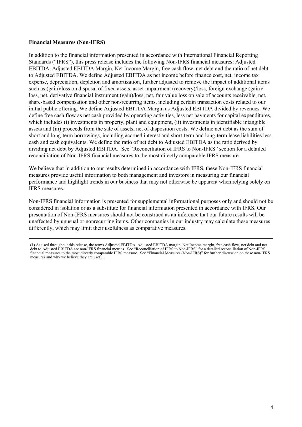 Financial Measures (Non-IFRS) In addition to the financial information presented in accordance with International Financial Reporting Standards (“IFRS”), this press release includes the following Non-IFRS financial measures: Adjusted EBITDA, Adjusted EBITDA Margin, Net Income Margin, free cash flow, net debt and the ratio of net debt to Adjusted EBITDA. We define Adjusted EBITDA as net income before finance cost, net, income tax expense, depreciation, depletion and amortization, further adjusted to remove the impact of additional items such as (gain)/loss on disposal of fixed assets, asset impairment (recovery)/loss, foreign exchange (gain)/ loss, net, derivative financial instrument (gain)/loss, net, fair value loss on sale of accounts receivable, net, share-based compensation and other non-recurring items, including certain transaction costs related to our initial public offering. We define Adjusted EBITDA Margin as Adjusted EBITDA divided by revenues. We define free cash flow as net cash provided by operating activities, less net payments for capital expenditures, which includes (i) investments in property, plant and equipment, (ii) investments in identifiable intangible assets and (iii) proceeds from the sale of assets, net of disposition costs. We define net debt as the sum of short and long-term borrowings, including accrued interest and short-term and long-term lease liabilities less cash and cash equivalents. We define the ratio of net debt to Adjusted EBITDA as the ratio derived by dividing net debt by Adjusted EBITDA. See “Reconciliation of IFRS to Non-IFRS” section for a detailed reconciliation of Non-IFRS financial measures to the most directly comparable IFRS measure. We believe that in addition to our results determined in accordance with IFRS, these Non-IFRS financial measures provide useful information to both management and investors in measuring our financial performance and highlight trends in our business that may not otherwise be apparent when relying solely on IFRS measures. Non-IFRS financial information is presented for supplemental informational purposes only and should not be considered in isolation or as a substitute for financial information presented in accordance with IFRS. Our presentation of Non-IFRS measures should not be construed as an inference that our future results will be unaffected by unusual or nonrecurring items. Other companies in our industry may calculate these measures differently, which may limit their usefulness as comparative measures. (1) As used throughout this release, the terms Adjusted EBITDA, Adjusted EBITDA margin, Net Income margin, free cash flow, net debt and net debt to Adjusted EBITDA are non-IFRS financial metrics. See “Reconciliation of IFRS to Non-IFRS” for a detailed reconciliation of Non-IFRS financial measures to the most directly comparable IFRS measure. See “Financial Measures (Non-IFRS)” for further discussion on these non-IFRS measures and why we believe they are useful. 4
