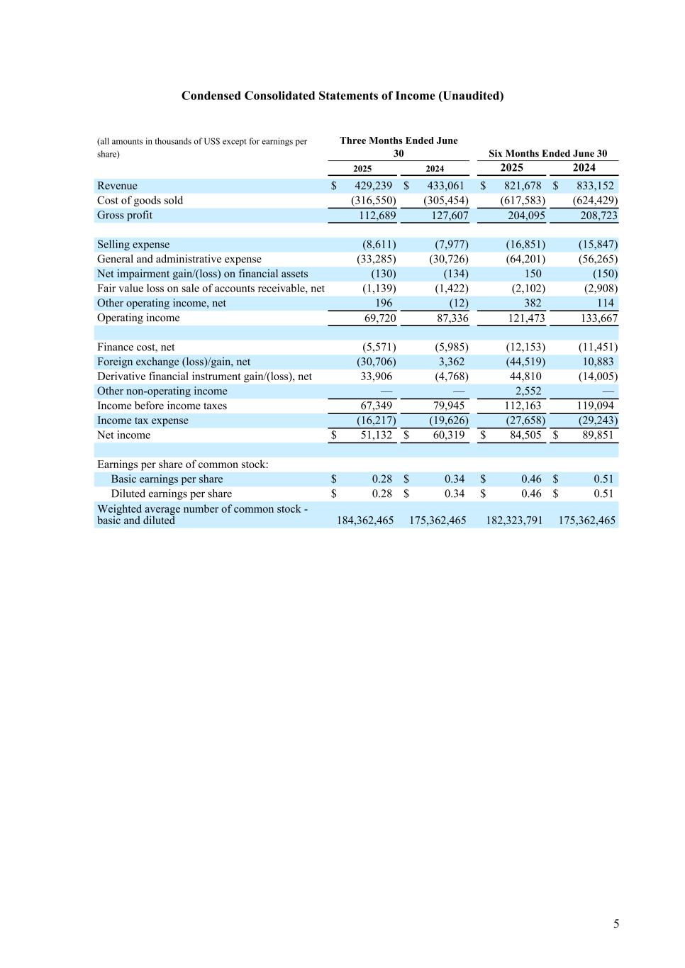 Condensed Consolidated Statements of Income (Unaudited) (all amounts in thousands of US$ except for earnings per share) Three Months Ended June 30 Six Months Ended June 30 2025 2024 2025 2024 Revenue $ 429,239 $ 433,061 $ 821,678 $ 833,152 Cost of goods sold (316,550) (305,454) (617,583) (624,429) Gross profit 112,689 127,607 204,095 208,723 Selling expense (8,611) (7,977) (16,851) (15,847) General and administrative expense (33,285) (30,726) (64,201) (56,265) Net impairment gain/(loss) on financial assets (130) (134) 150 (150) Fair value loss on sale of accounts receivable, net (1,139) (1,422) (2,102) (2,908) Other operating income, net 196 (12) 382 114 Operating income 69,720 87,336 121,473 133,667 Finance cost, net (5,571) (5,985) (12,153) (11,451) Foreign exchange (loss)/gain, net (30,706) 3,362 (44,519) 10,883 Derivative financial instrument gain/(loss), net 33,906 (4,768) 44,810 (14,005) Other non-operating income — — 2,552 — Income before income taxes 67,349 79,945 112,163 119,094 Income tax expense (16,217) (19,626) (27,658) (29,243) Net income $ 51,132 $ 60,319 $ 84,505 $ 89,851 Earnings per share of common stock: Basic earnings per share $ 0.28 $ 0.34 $ 0.46 $ 0.51 Diluted earnings per share $ 0.28 $ 0.34 $ 0.46 $ 0.51 Weighted average number of common stock - basic and diluted 184,362,465 175,362,465 182,323,791 175,362,465 5