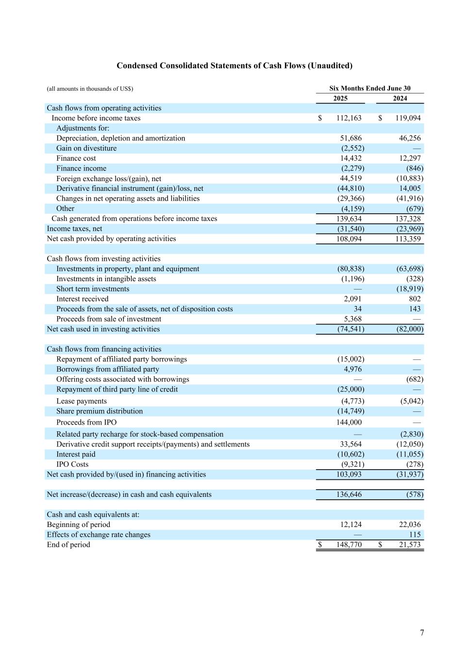 Condensed Consolidated Statements of Cash Flows (Unaudited) (all amounts in thousands of US$) Six Months Ended June 30 2025 2024 Cash flows from operating activities Income before income taxes $ 112,163 $ 119,094 Adjustments for: Depreciation, depletion and amortization 51,686 46,256 Gain on divestiture (2,552) — Finance cost 14,432 12,297 Finance income (2,279) (846) Foreign exchange loss/(gain), net 44,519 (10,883) Derivative financial instrument (gain)/loss, net (44,810) 14,005 Changes in net operating assets and liabilities (29,366) (41,916) Other (4,159) (679) Cash generated from operations before income taxes 139,634 137,328 Income taxes, net (31,540) (23,969) Net cash provided by operating activities 108,094 113,359 Cash flows from investing activities Investments in property, plant and equipment (80,838) (63,698) Investments in intangible assets (1,196) (328) Short term investments — (18,919) Interest received 2,091 802 Proceeds from the sale of assets, net of disposition costs 34 143 Proceeds from sale of investment 5,368 — Net cash used in investing activities (74,541) (82,000) Cash flows from financing activities Repayment of affiliated party borrowings (15,002) — Borrowings from affiliated party 4,976 — Offering costs associated with borrowings — (682) Repayment of third party line of credit (25,000) — Lease payments (4,773) (5,042) Share premium distribution (14,749) — Proceeds from IPO 144,000 — Related party recharge for stock-based compensation — (2,830) Derivative credit support receipts/(payments) and settlements 33,564 (12,050) Interest paid (10,602) (11,055) IPO Costs (9,321) (278) Net cash provided by/(used in) financing activities 103,093 (31,937) Net increase/(decrease) in cash and cash equivalents 136,646 (578) Cash and cash equivalents at: Beginning of period 12,124 22,036 Effects of exchange rate changes — 115 End of period $ 148,770 $ 21,573 7