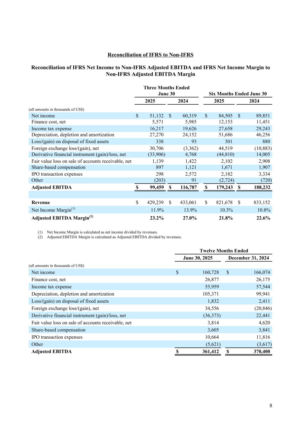 Reconciliation of IFRS to Non-IFRS Reconciliation of IFRS Net Income to Non-IFRS Adjusted EBITDA and IFRS Net Income Margin to Non-IFRS Adjusted EBITDA Margin Three Months Ended June 30 Six Months Ended June 30 2025 2024 2025 2024 (all amounts in thousands of US$) Net income $ 51,132 14,233 $ 60,319 $ 84,505 $ 89,851 Finance cost, net 5,571 14,233 5,985 12,153 11,451 Income tax expense 16,217 14,233 19,626 27,658 29,243 Depreciation, depletion and amortization 27,270 14,233 24,152 51,686 46,256 Loss/(gain) on disposal of fixed assets 338 14,233 93 301 880 Foreign exchange loss/(gain), net 30,706 14,233 (3,362) 44,519 (10,883) Derivative financial instrument (gain)/loss, net (33,906) 14,233 4,768 (44,810) 14,005 Fair value loss on sale of accounts receivable, net 1,139 14,233 1,422 2,102 2,908 Share-based compensation 897 14,233 1,121 1,671 1,907 IPO transaction expenses 298 14,233 2,572 2,182 3,334 Other (203) 14,233 91 (2,724) (720) Adjusted EBITDA $ 99,459 $ 116,787 $ 179,243 $ 188,232 Revenue $ 429,239 $ 433,061 $ 821,678 $ 833,152 Net Income Margin(1) 11.9 % 13.9 % 10.3 % 10.8 % Adjusted EBITDA Margin(2) 23.2 % 27.0 % 21.8 % 22.6 % (1) Net Income Margin is calculated as net income divided by revenues. (2) Adjusted EBITDA Margin is calculated as Adjusted EBITDA divided by revenues. Twelve Months Ended June 30, 2025 December 31, 2024 (all amounts in thousands of US$) Net income $ 160,728 $ 166,074 Finance cost, net 26,877 26,175 Income tax expense 55,959 57,544 Depreciation, depletion and amortization 105,371 99,941 Loss/(gain) on disposal of fixed assets 1,832 2,411 Foreign exchange loss/(gain), net 34,556 (20,846) Derivative financial instrument (gain)/loss, net (36,373) 22,441 Fair value loss on sale of accounts receivable, net 3,814 4,620 Share-based compensation 3,605 3,841 IPO transaction expenses 10,664 11,816 Other (5,621) (3,617) Adjusted EBITDA $ 361,412 $ 370,400 8