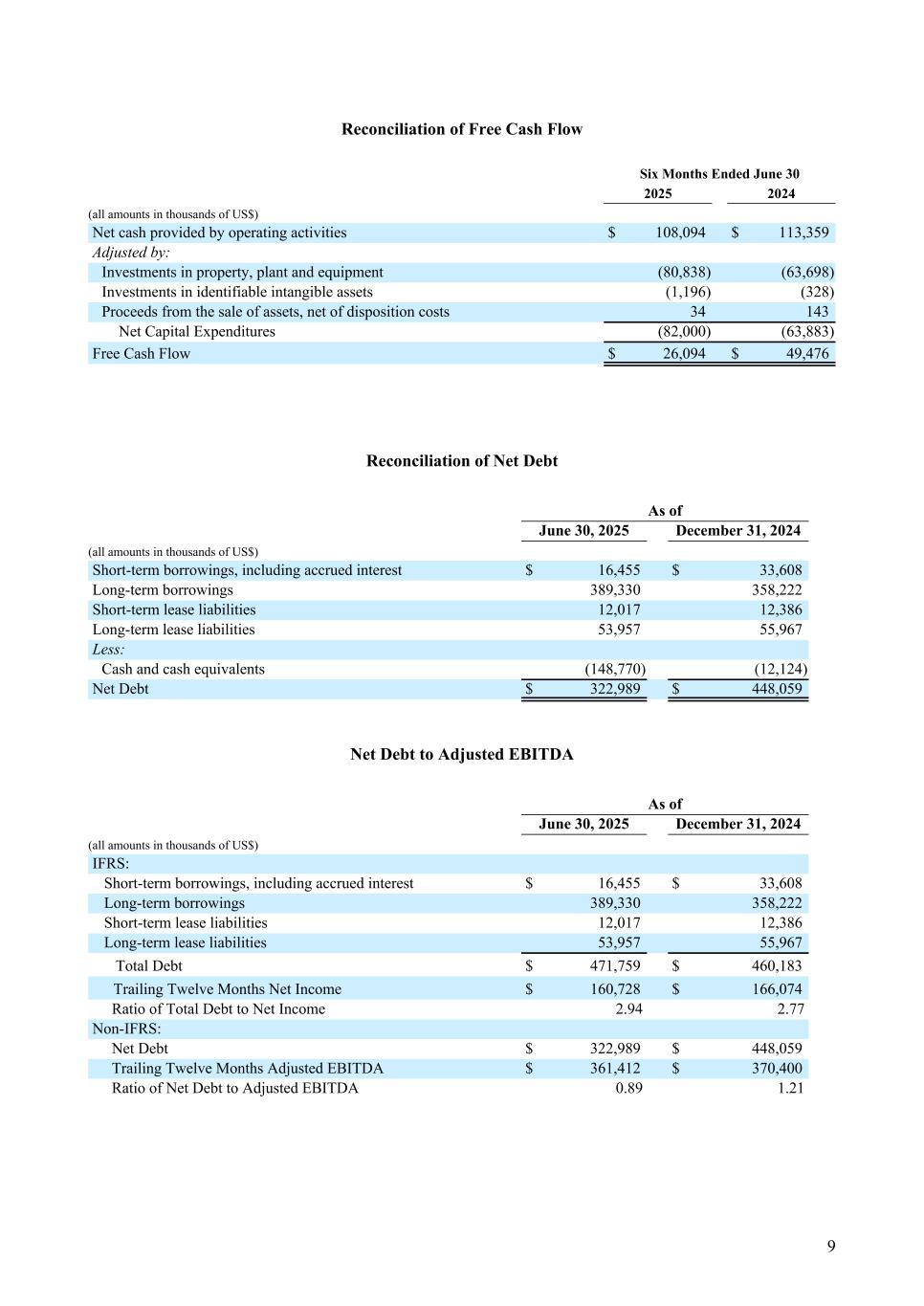 Reconciliation of Free Cash Flow Six Months Ended June 30 2025 2 2024 (all amounts in thousands of US$) Net cash provided by operating activities $ 108,094 $ 113,359 Adjusted by: Investments in property, plant and equipment (80,838) (63,698) Investments in identifiable intangible assets (1,196) (328) Proceeds from the sale of assets, net of disposition costs 34 143 Net Capital Expenditures (82,000) (63,883) Free Cash Flow $ 26,094 $ 49,476 Reconciliation of Net Debt As of June 30, 2025 December 31, 2024 (all amounts in thousands of US$) Short-term borrowings, including accrued interest $ 16,455 $ 33,608 Long-term borrowings 389,330 358,222 Short-term lease liabilities 12,017 12,386 Long-term lease liabilities 53,957 55,967 Less: Cash and cash equivalents (148,770) (12,124) Net Debt $ 322,989 $ 448,059 Net Debt to Adjusted EBITDA As of June 30, 2025 December 31, 2024 (all amounts in thousands of US$) IFRS: Short-term borrowings, including accrued interest $ 16,455 $ 33,608 Long-term borrowings 389,330 358,222 Short-term lease liabilities 12,017 12,386 Long-term lease liabilities 53,957 55,967 Total Debt $ 471,759 $ 460,183 Trailing Twelve Months Net Income $ 160,728 $ 166,074 Ratio of Total Debt to Net Income 2.94 2.77 Non-IFRS: Net Debt $ 322,989 $ 448,059 Trailing Twelve Months Adjusted EBITDA $ 361,412 $ 370,400 Ratio of Net Debt to Adjusted EBITDA 0.89 1.21 9
