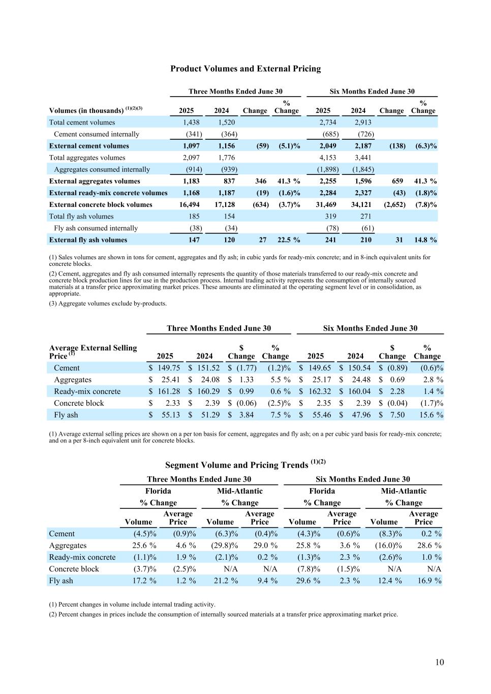Product Volumes and External Pricing Three Months Ended June 30 Six Months Ended June 30 Volumes (in thousands) (1)(2)(3) 2025 2024 Change % Change 2025 2024 Change % Change Total cement volumes 1,438 1,520 2,734 2,913 Cement consumed internally (341) (364) (685) (726) External cement volumes 1,097 1,156 (59) (5.1) % 2,049 2,187 (138) (6.3) % Total aggregates volumes 2,097 1,776 4,153 3,441 Aggregates consumed internally (914) (939) (1,898) (1,845) External aggregates volumes 1,183 837 346 41.3 % 2,255 1,596 659 41.3 % External ready-mix concrete volumes 1,168 1,187 (19) (1.6) % 2,284 2,327 (43) (1.8) % External concrete block volumes 16,494 17,128 (634) (3.7) % 31,469 34,121 (2,652) (7.8) % Total fly ash volumes 185 154 319 271 Fly ash consumed internally (38) (34) (78) (61) External fly ash volumes 147 120 27 22.5 % 241 210 31 14.8 % (1) Sales volumes are shown in tons for cement, aggregates and fly ash; in cubic yards for ready-mix concrete; and in 8-inch equivalent units for concrete blocks. (2) Cement, aggregates and fly ash consumed internally represents the quantity of those materials transferred to our ready-mix concrete and concrete block production lines for use in the production process. Internal trading activity represents the consumption of internally sourced materials at a transfer price approximating market prices. These amounts are eliminated at the operating segment level or in consolidation, as appropriate. (3) Aggregate volumes exclude by-products. Three Months Ended June 30 Six Months Ended June 30 Average External Selling Price (1) 2025 2024 $ Change % Change 2025 2024 $ Change % Change Cement $ 149.75 $ 151.52 $ (1.77) (1.2) % $ 149.65 $ 150.54 $ (0.89) (0.6) % Aggregates $ 25.41 $ 24.08 $ 1.33 5.5 % $ 25.17 $ 24.48 $ 0.69 2.8 % Ready-mix concrete $ 161.28 $ 160.29 $ 0.99 0.6 % $ 162.32 $ 160.04 $ 2.28 1.4 % Concrete block $ 2.33 $ 2.39 $ (0.06) (2.5) % $ 2.35 $ 2.39 $ (0.04) (1.7) % Fly ash $ 55.13 $ 51.29 $ 3.84 7.5 % $ 55.46 $ 47.96 $ 7.50 15.6 % (1) Average external selling prices are shown on a per ton basis for cement, aggregates and fly ash; on a per cubic yard basis for ready-mix concrete; and on a per 8-inch equivalent unit for concrete blocks. Segment Volume and Pricing Trends (1)(2) Three Months Ended June 30 Six Months Ended June 30 Florida Mid-Atlantic Florida Mid-Atlantic % Change % Change % Change % Change Volume Average Price Volume Average Price Volume Average Price Volume Average Price Cement (4.5) % (0.9) % (6.3) % (0.4) % (4.3) % (0.6) % (8.3) % 0.2 % Aggregates 25.6 % 4.6 % (29.8) % 29.0 % 25.8 % 3.6 % (16.0) % 28.6 % Ready-mix concrete (1.1) % 1.9 % (2.1) % 0.2 % (1.3) % 2.3 % (2.6) % 1.0 % Concrete block (3.7) % (2.5) % N/A N/A (7.8) % (1.5) % N/A N/A Fly ash 17.2 % 1.2 % 21.2 % 9.4 % 29.6 % 2.3 % 12.4 % 16.9 % (1) Percent changes in volume include internal trading activity. (2) Percent changes in prices include the consumption of internally sourced materials at a transfer price approximating market price. 10
