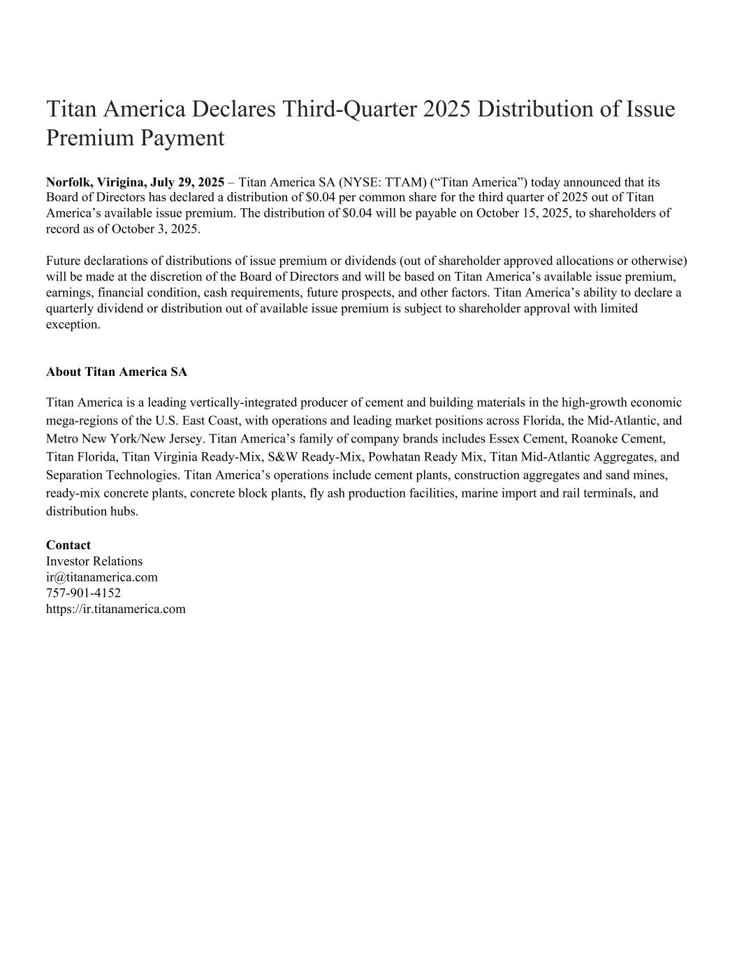 Titan America Declares Third-Quarter 2025 Distribution of Issue Premium Payment Norfolk, Virigina, July 29, 2025 – Titan America SA (NYSE: TTAM) (“Titan America”) today announced that its Board of Directors has declared a distribution of $0.04 per common share for the third quarter of 2025 out of Titan America’s available issue premium. The distribution of $0.04 will be payable on October 15, 2025, to shareholders of record as of October 3, 2025. Future declarations of distributions of issue premium or dividends (out of shareholder approved allocations or otherwise) will be made at the discretion of the Board of Directors and will be based on Titan America’s available issue premium, earnings, financial condition, cash requirements, future prospects, and other factors. Titan America’s ability to declare a quarterly dividend or distribution out of available issue premium is subject to shareholder approval with limited exception. About Titan America SA Titan America is a leading vertically-integrated producer of cement and building materials in the high-growth economic mega-regions of the U.S. East Coast, with operations and leading market positions across Florida, the Mid-Atlantic, and Metro New York/New Jersey. Titan America’s family of company brands includes Essex Cement, Roanoke Cement, Titan Florida, Titan Virginia Ready-Mix, S&W Ready-Mix, Powhatan Ready Mix, Titan Mid-Atlantic Aggregates, and Separation Technologies. Titan America’s operations include cement plants, construction aggregates and sand mines, ready-mix concrete plants, concrete block plants, fly ash production facilities, marine import and rail terminals, and distribution hubs. Contact Investor Relations ir@titanamerica.com 757-901-4152 https://ir.titanamerica.com