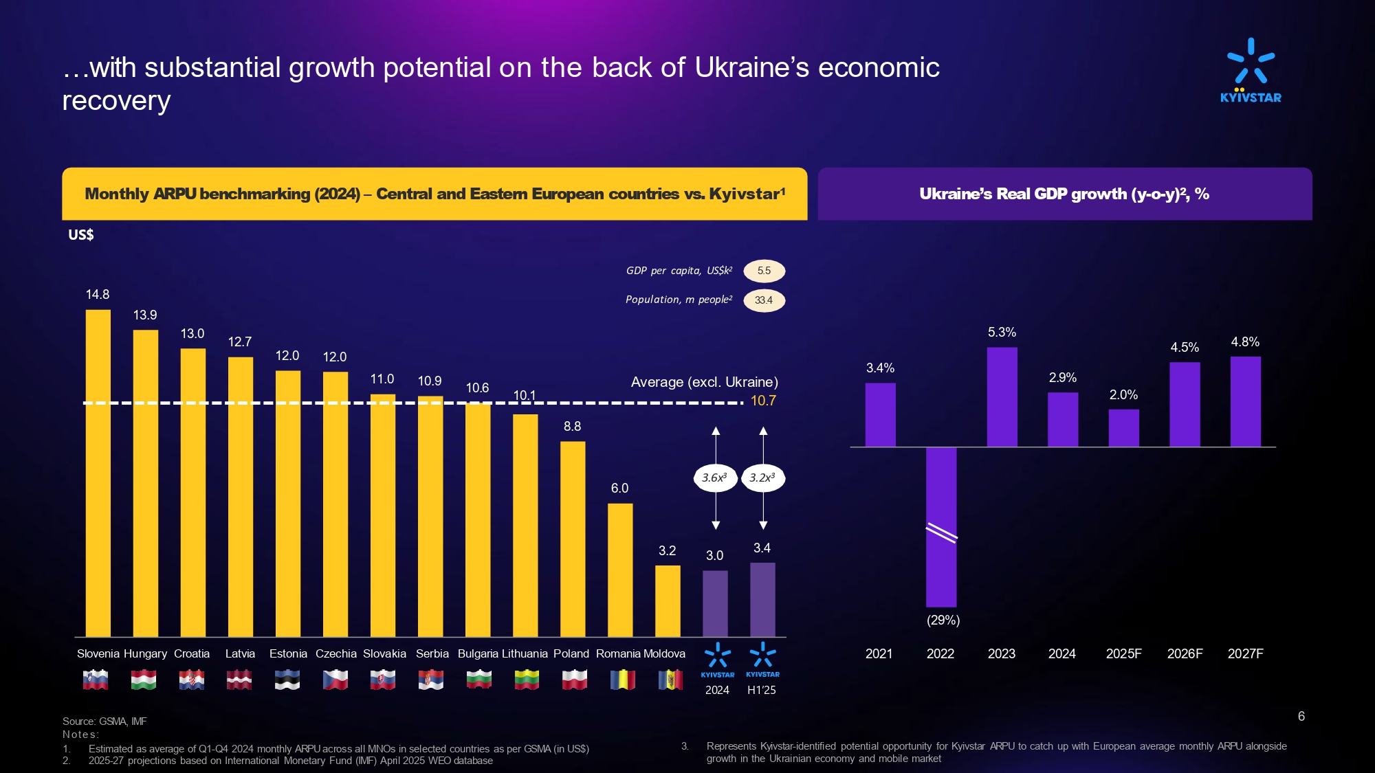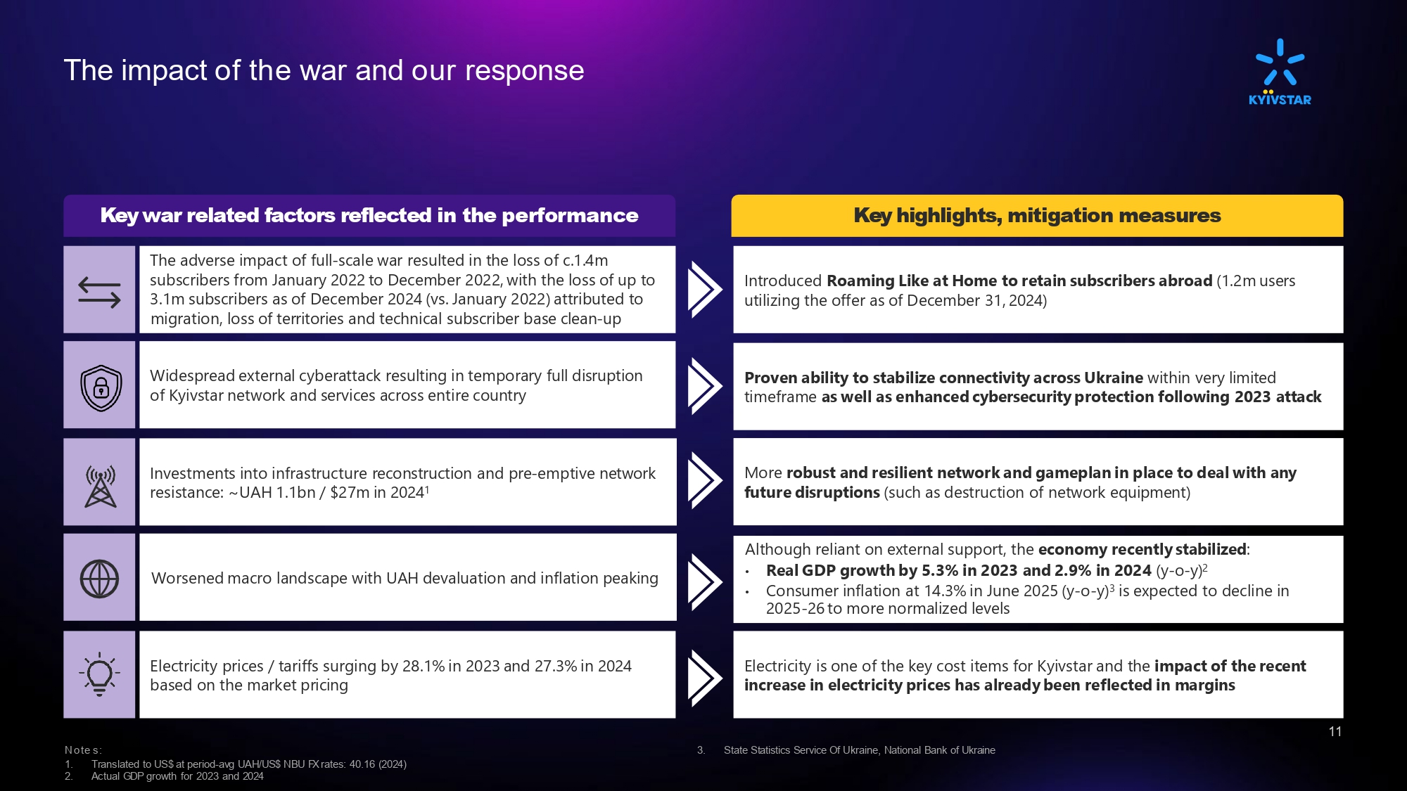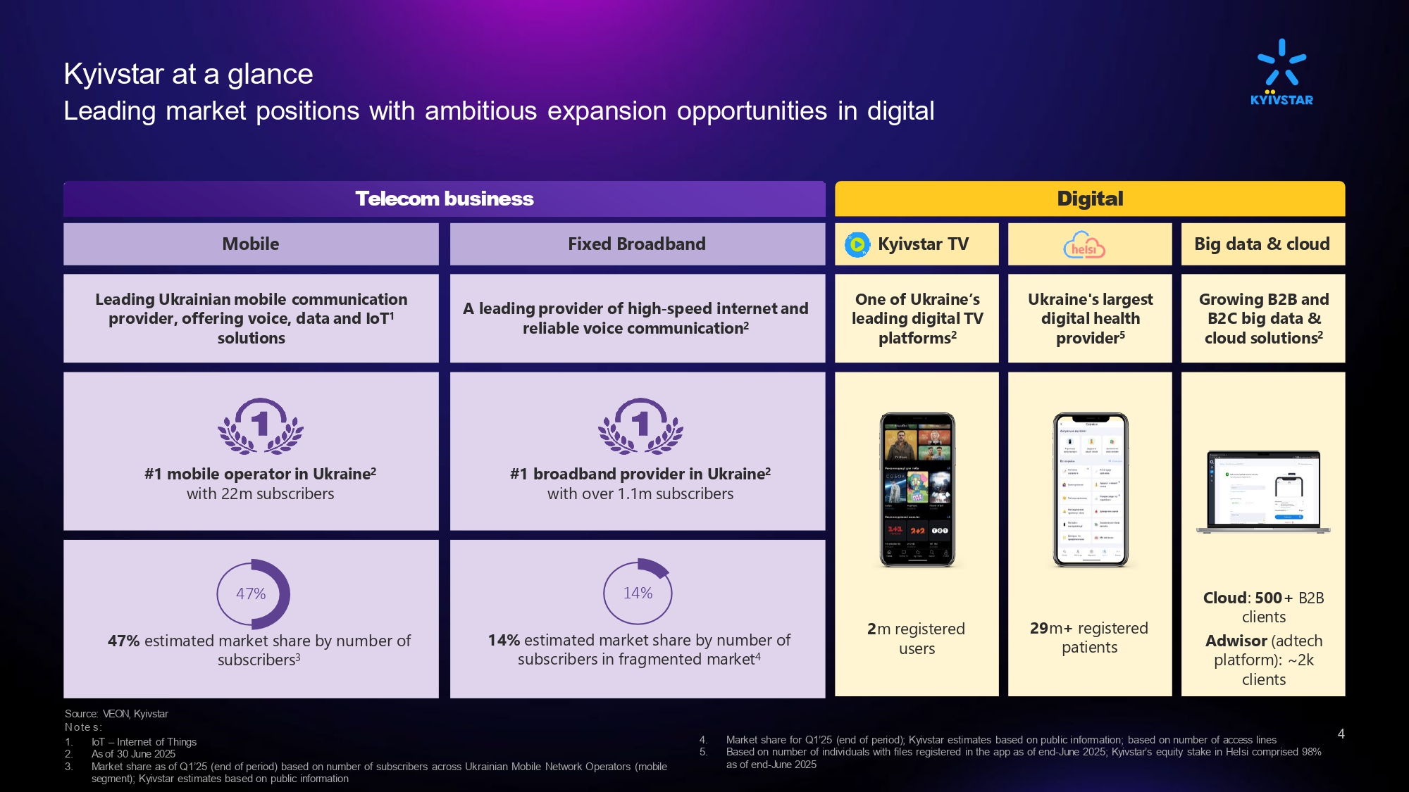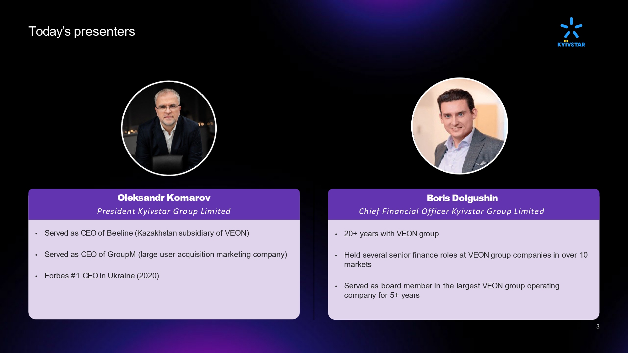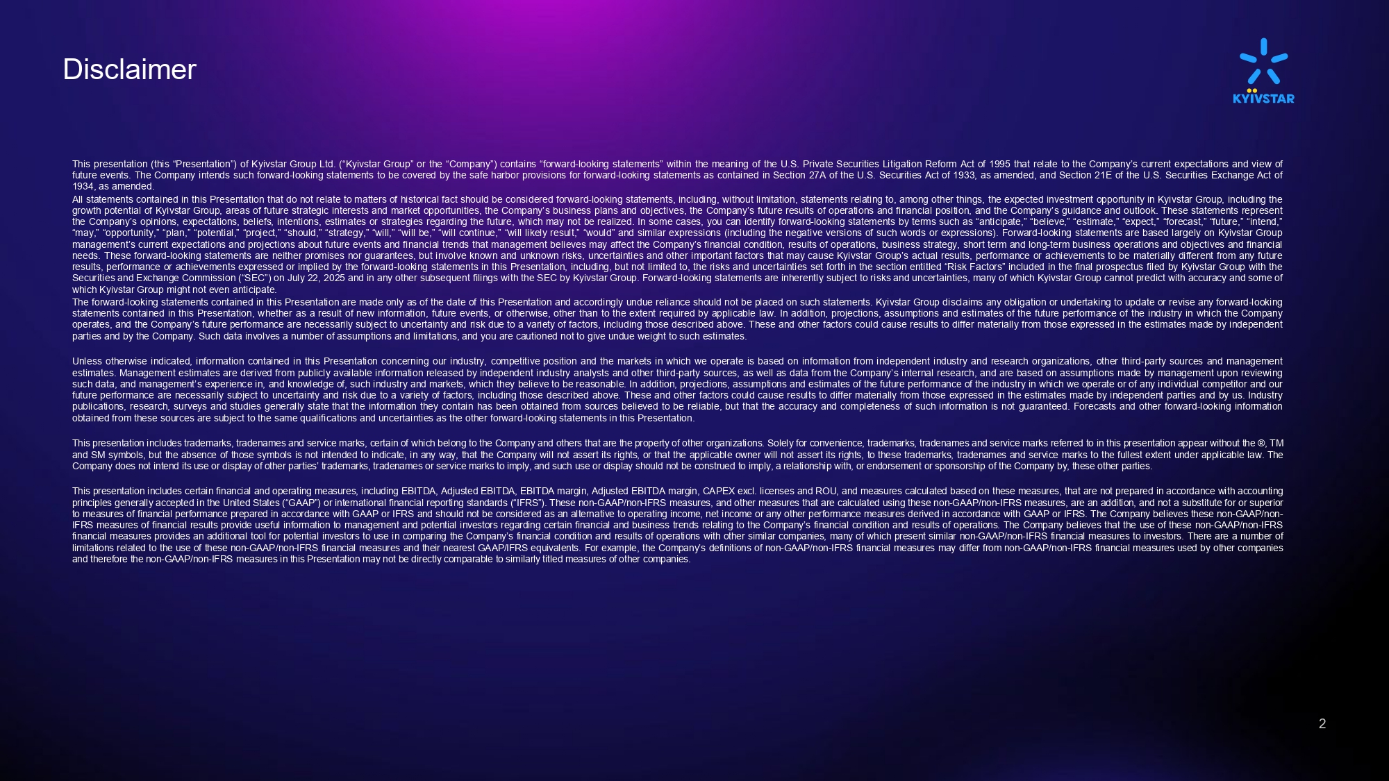 Disclaimer 2 This presentation (this “Presentation”) of Kyivstar Group Ltd . (“Kyivstar Group” or the “Company”) contains “forward - looking statements” within the meaning of the U . S . Private Securities Litigation Reform Act of 1995 that relate to the Company’s current expectations and view of future events . The Company intends such forward - looking statements to be covered by the safe harbor provisions for forward - looking statements as contained in Section 27 A of the U . S . Securities Act of 1933 , as amended, and Section 21 E of the U . S . Securities Exchange Act of 1934 , as amended . All statements contained in this Presentation that do not relate to matters of historical fact should be considered forward - looking statements, including, without limitation, statements relating to, among other things, the expected investment opportunity in Kyivstar Group, including the growth potential of Kyivstar Group, areas of future strategic interests and market opportunities, the Company’s business plans and objectives, the Company’s future results of operations and financial position, and the Company’s guidance and outlook . These statements represent the Company’s opinions, expectations, beliefs, intentions, estimates or strategies regarding the future, which may not be realized . In some cases, you can identify forward - looking statements by terms such as “anticipate,” “believe,” “estimate,” “expect,” “forecast,” “future,” “intend,” “may,” “opportunity,” “plan,” “potential,” “project,” “should,” “strategy,” “will,” “will be,” “will continue,” “will likely result,” “would” and similar expressions (including the negative versions of such words or expressions) . Forward - looking statements are based largely on Kyivstar Group management’s current expectations and projections about future events and financial trends that management believes may affect the Company’s financial condition, results of operations, business strategy, short term and long - term business operations and objectives and financial needs . These forward - looking statements are neither promises nor guarantees, but involve known and unknown risks, uncertainties and other important factors that may cause Kyivstar Group’s actual results, performance or achievements to be materially different from any future results, performance or achievements expressed or implied by the forward - looking statements in this Presentation, including, but not limited to, the risks and uncertainties set forth in the section entitled “Risk Factors” included in the final prospectus filed by Kyivstar Group with the Securities and Exchange Commission (“SEC”) on July 22 , 2025 and in any other subsequent filings with the SEC by Kyivstar Group . Forward - looking statements are inherently subject to risks and uncertainties, many of which Kyivstar Group cannot predict with accuracy and some of which Kyivstar Group might not even anticipate . The forward - looking statements contained in this Presentation are made only as of the date of this Presentation and accordingly undue reliance should not be placed on such statements . Kyivstar Group disclaims any obligation or undertaking to update or revise any forward - looking statements contained in this Presentation, whether as a result of new information, future events, or otherwise, other than to the extent required by applicable law . In addition, projections, assumptions and estimates of the future performance of the industry in which the Company operates, and the Company’s future performance are necessarily subject to uncertainty and risk due to a variety of factors, including those described above . These and other factors could cause results to differ materially from those expressed in the estimates made by independent parties and by the Company . Such data involves a number of assumptions and limitations, and you are cautioned not to give undue weight to such estimates . Unless otherwise indicated, information contained in this Presentation concerning our industry, competitive position and the markets in which we operate is based on information from independent industry and research organizations, other third - party sources and management estimates . Management estimates are derived from publicly available information released by independent industry analysts and other third - party sources, as well as data from the Company’s internal research, and are based on assumptions made by management upon reviewing such data, and management’s experience in, and knowledge of, such industry and markets, which they believe to be reasonable . In addition, projections, assumptions and estimates of the future performance of the industry in which we operate or of any individual competitor and our future performance are necessarily subject to uncertainty and risk due to a variety of factors, including those described above . These and other factors could cause results to differ materially from those expressed in the estimates made by independent parties and by us . Industry publications, research, surveys and studies generally state that the information they contain has been obtained from sources believed to be reliable, but that the accuracy and completeness of such information is not guaranteed . Forecasts and other forward - looking information obtained from these sources are subject to the same qualifications and uncertainties as the other forward - looking statements in this Presentation . This presentation includes trademarks, tradenames and service marks, certain of which belong to the Company and others that are the property of other organizations . Solely for convenience, trademarks, tradenames and service marks referred to in this presentation appear without the ®, TM and SM symbols, but the absence of those symbols is not intended to indicate, in any way, that the Company will 