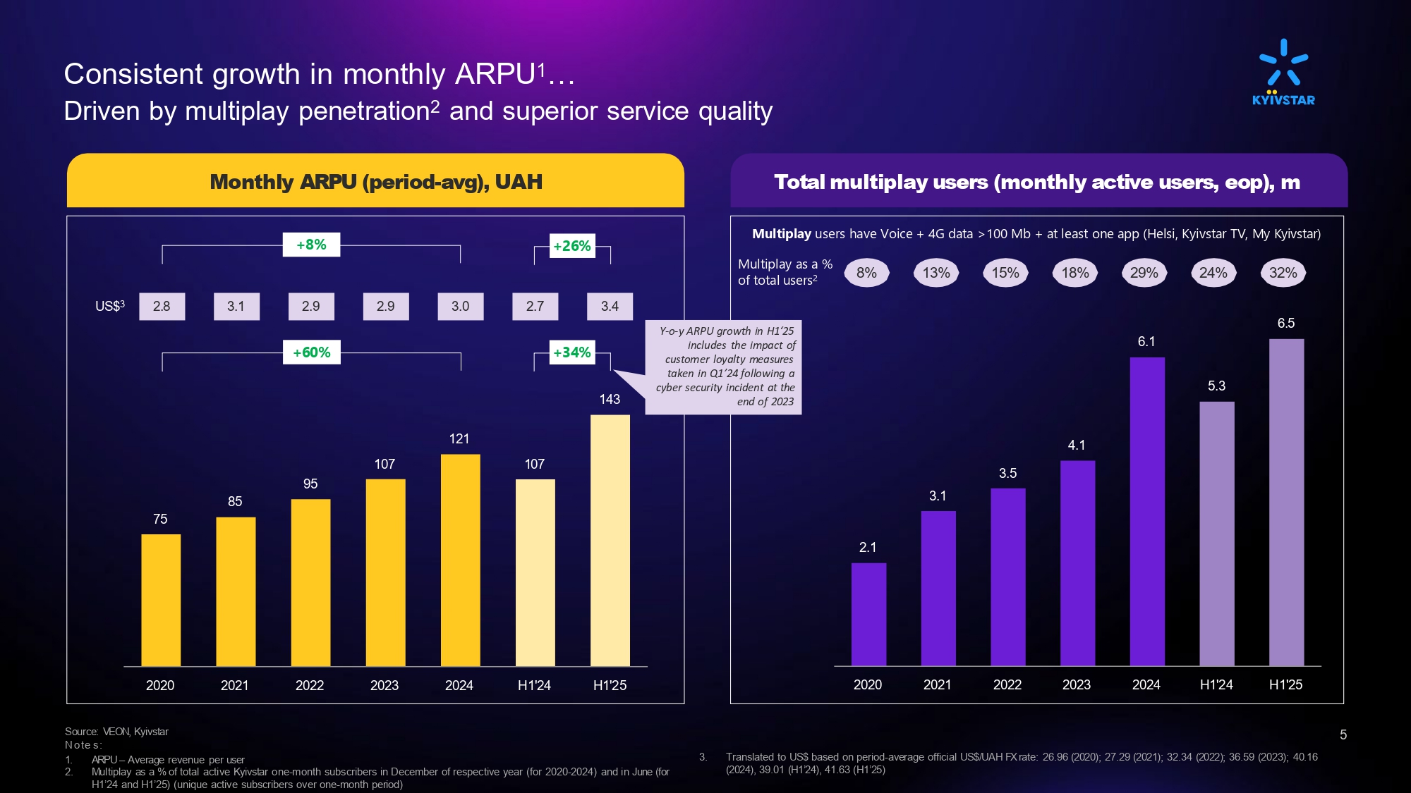 Kyivstar at a glance Leading market positions with ambitious expansion opportunities in digital 4 Telecom business Digital Leading Ukrainian mobile communication provider, offering voice, data and IoT 1 solutions Leading Ukrainian mobile communication provider, offering voice, data and IoT 1 solutions A leading provider of high - speed internet and reliable voice communication 2 A leading provider of high - speed internet and reliable voice communication 2 One of Ukraine’s leading digital TV platforms 2 One of Ukraine’s leading digital TV platforms 2 Ukraine's largest digital health provider 5 Ukraine's largest digital health provider 5 Growing B2B and B2C big data & cloud solutions 2 Growing B2B and B2C big data & cloud solutions 2 Big data & cloud Big data & cloud Mobile Mobile Fixed Broadband Fixed Broadband Kyivstar TV Kyivstar TV #1 mobile operator in Ukraine 2 with 22m subscribers #1 broadband provider in Ukraine 2 with over 1.1m subscribers 47% estimated market share by number of subscribers 3 47% 14% estimated market share by number of subscribers in fragmented market 4 14% 2 m registered users 29 m + registered patients Cloud : 500+ B2B clients Adwisor (adtech platform): ~2k clients Source: VEON, Kyivstar N o te s : 1. IoT – Internet of Things 2. As of 30 June 2025 3. Market share as of Q1’25 (end of period) based on number of subscribers across Ukrainian Mobile Network Operators (mobile segment); Kyivstar estimates based on public information 4. Market share for Q1’25 (end of period); Kyivstar estimates based on public information; based on number of access lines 5. Based on number of individuals with files registered in the app as of end - June 2025; Kyivstar’s equity stake in Helsi comprised 98% as of end - June 2025