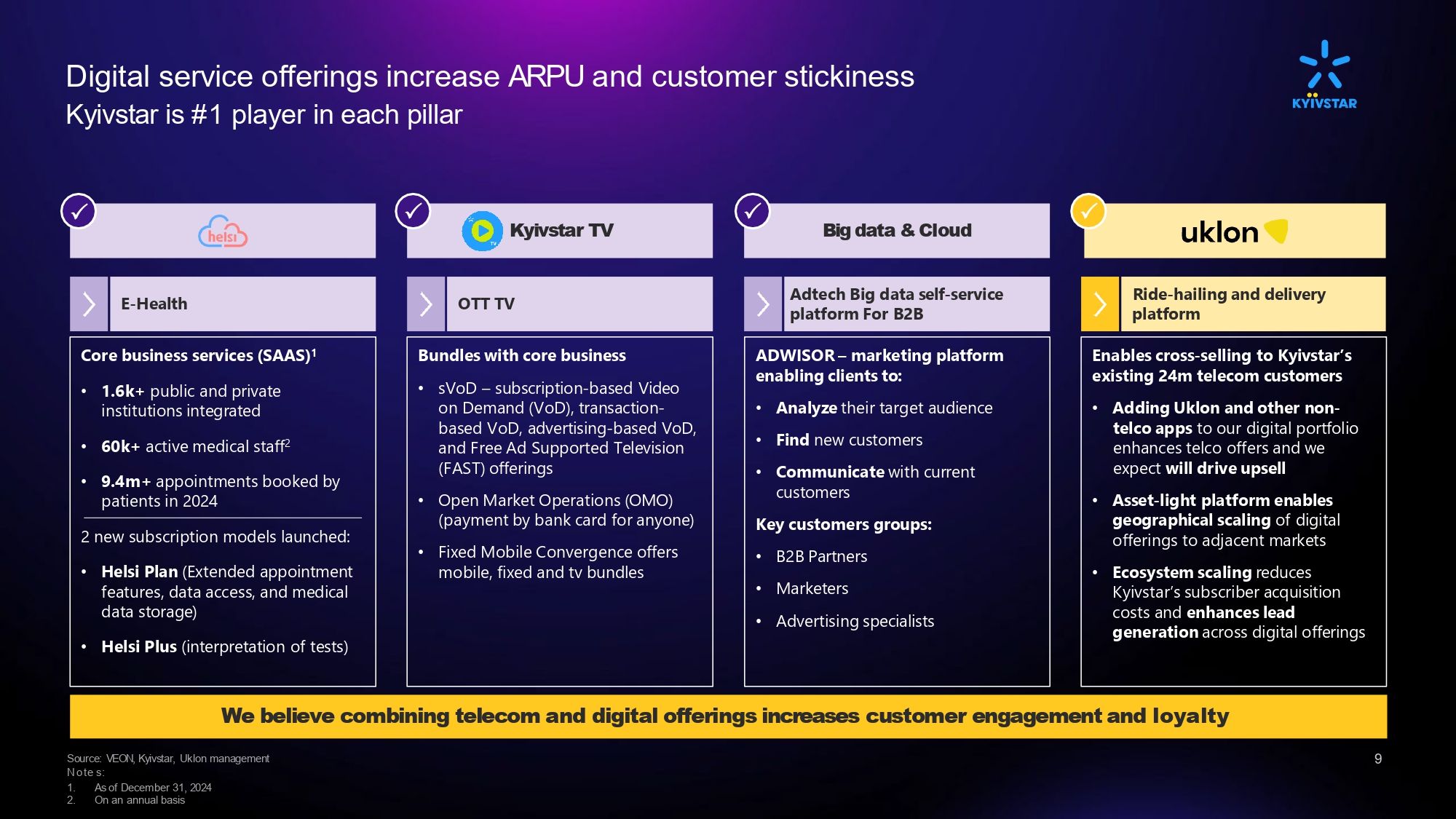 8 Leveraging our loyal subscriber base with digital products and services Strong growth with low customer acquisition costs Big Data & AdTech platform 2.0 m Kyivstar TV registered users 5.4 m app MAU 1,3 0.1 m B2B end users (licenses) 3 1 m partner apps MAU 1,3 Real - time kinematic 2 , Cybersecurity, IoT platform, Digital marketplace 2.5 m app MAU 1,3 ~50 m SMS sent through ADWISOR platform 3 Source: VEON, Kyivstar, Uklon management N o te s : 1. MAU – Monthly active users 2. Services provided by Kyivstar for selected industries based on high precision navigation 3. For June 2025 4. For 1H 2025 Areas of future strategic interests and identified potential market opportunity 83 m rides 4 3.5 m+ MAU 3