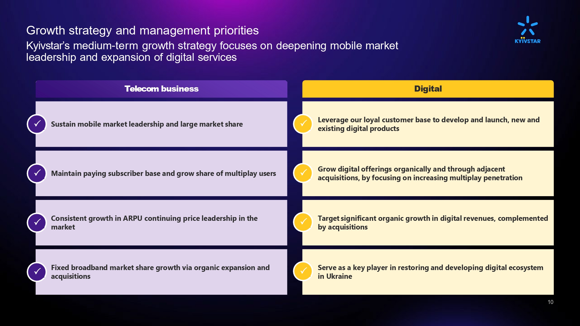 Enables cross - selling to Kyivstar’s existing 24m telecom customers • Adding Uklon and other non - telco apps to our digital portfolio enhances telco offers and we expect will drive upsell • Asset - light platform enables geographical scaling of digital offerings to adjacent markets • Ecosystem scaling reduces Kyivstar’s subscriber acquisition costs and enhances lead generation across digital offerings 9 Digital service offerings increase ARPU and customer stickiness Kyivstar is #1 player in each pillar Source: VEON, Kyivstar, Uklon management N o te s : 1. As of December 31, 2024 2. On an annual basis Kyivstar TV Bundles with core business • sVoD – subscription - based Video on Demand (VoD), transaction - based VoD, advertising - based VoD, and Free Ad Supported Television (FAST) offerings • Open Market Operations (OMO) (payment by bank card for anyone) • Fixed Mobile Convergence offers mobile, fixed and tv bundles OTT TV Core business services (SAAS) 1 • 1.6k+ public and private institutions integrated • 60k+ active medical staff 2 • 9.4m+ appointments booked by patients in 2024 2 new subscription models launched: • Helsi Plan (Extended appointment features, data access, and medical data storage) • Helsi Plus (interpretation of tests) E - Health Big data & Cloud ADWISOR – marketing platform enabling clients to: • Analyze their target audience • Find new customers • Communicate with current customers Key customers groups: • B2B Partners • Marketers • Advertising specialists Adtech Big data self - service platform For B2B Ride - hailing and delivery platform ᴣ ᴣ ᴣ We believe combining telecom and digital offerings increases customer engagement and loyalty ᴣ