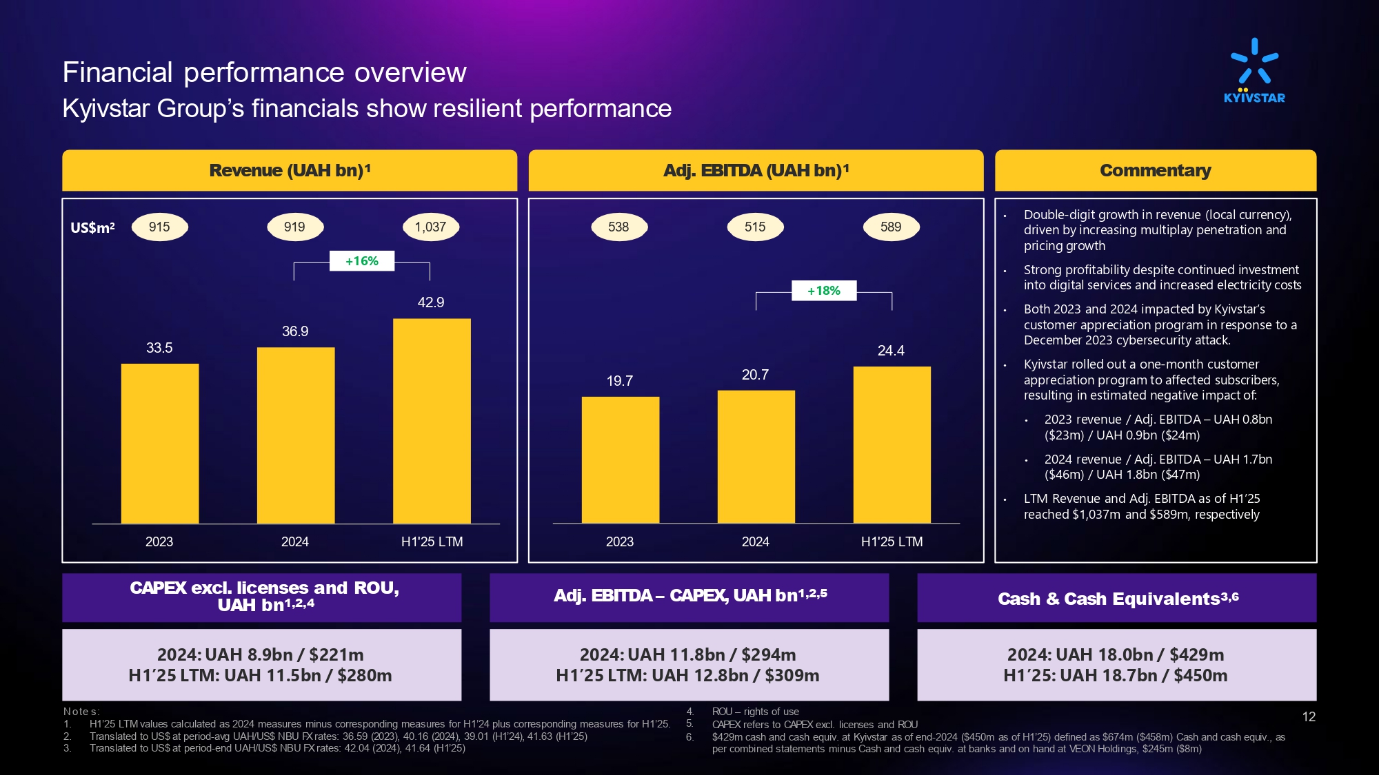11 The impact of the war and our response N o te s : 1. Translated to US$ at period - avg UAH/US$ NBU FX rates: 40.16 (2024) 2. Actual GDP growth for 2023 and 2024 3. State Statistics Service Of Ukraine, National Bank of Ukraine Key highlights, mitigation measures Introduced Roaming Like at Home to retain subscribers abroad (1.2m users utilizing the offer as of December 31, 2024) Key war related factors reflected in the performance The adverse impact of full - scale war resulted in the loss of c.1.4m subscribers from January 2022 to December 2022, with the loss of up to 3.1m subscribers as of December 2024 (vs. January 2022) attributed to migration, loss of territories and technical subscriber base clean - up More robust and resilient network and gameplan in place to deal with any future disruptions (such as destruction of network equipment) Investments into infrastructure reconstruction and pre - emptive network resistance: ~UAH 1.1bn / $27m in 2024 1 Electricity is one of the key cost items for Kyivstar and the impact of the recent increase in electricity prices has already been reflected in margins Electricity prices / tariffs surging by 28.1% in 2023 and 27.3% in 2024 based on the market pricing Although reliant on external support, the economy recently stabilized : • Real GDP growth by 5.3% in 2023 and 2.9% in 2024 (y - o - y) 2 • Consumer inflation at 14.3% in June 2025 (y - o - y) 3 is expected to decline in 2025 - 26 to more normalized levels Worsened macro landscape with UAH devaluation and inflation peaking Proven ability to stabilize connectivity across Ukraine within very limited timeframe as well as enhanced cybersecurity protection following 2023 attack Widespread external cyberattack resulting in temporary full disruption of Kyivstar network and services across entire country