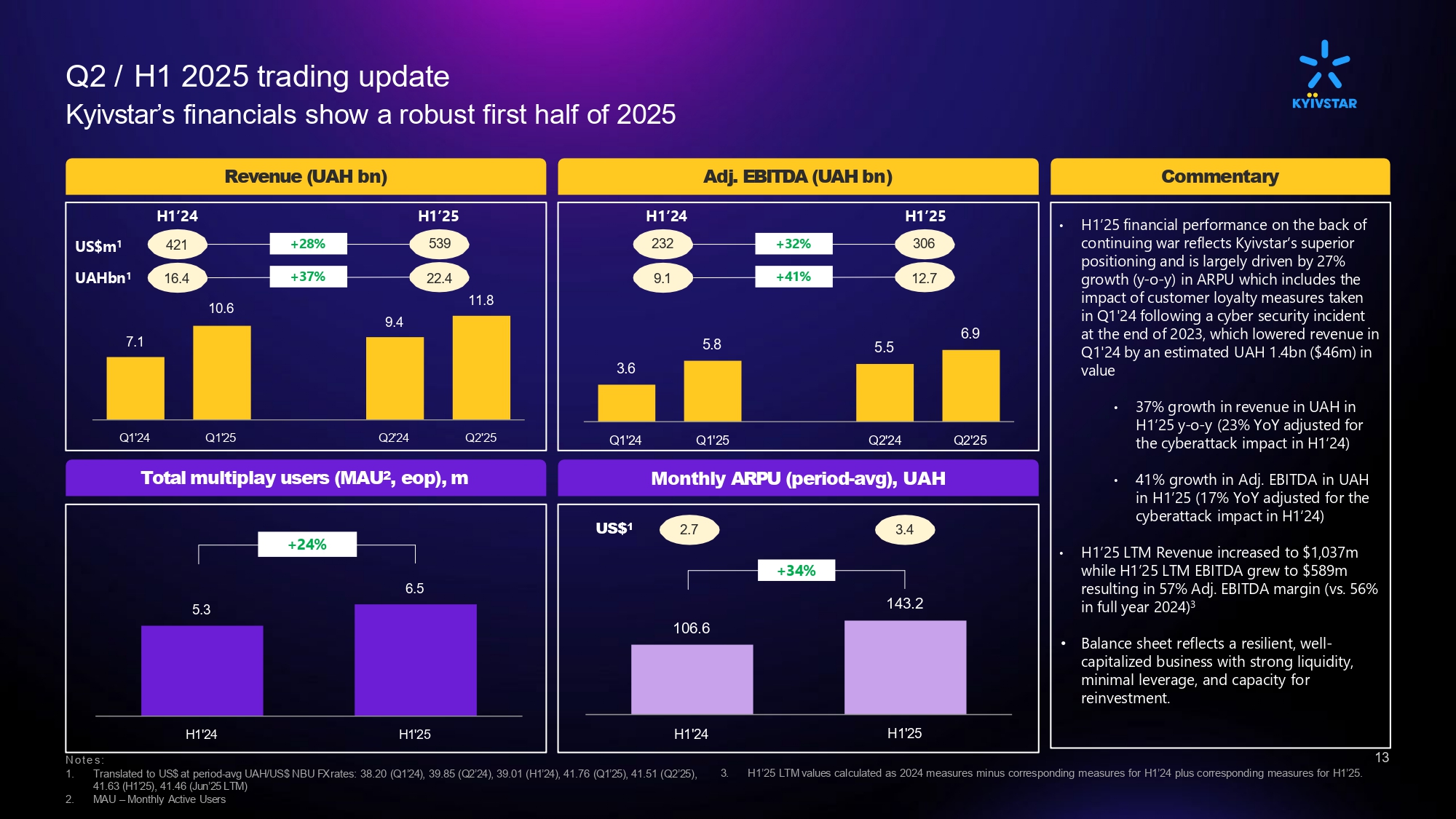 19.7 20.7 24.4 2023 2024 H1'25 LTM 33.5 36.9 42.9 2023 2024 H1'25 LTM 12 Financial performance overview Kyivstar Group’s financials show resilient performance N o te s : 1. H1’25 LTM values calculated as 2024 measures minus corresponding measures for H1’24 plus corresponding measures for H1’25. 2. Translated to US$ at period - avg UAH/US$ NBU FX rates: 36.59 (2023), 40.16 (2024), 39.01 (H1’24), 41.63 (H1’25) 3. Translated to US$ at period - end UAH/US$ NBU FX rates: 42.04 (2024), 41.64 (H1’25) 4. ROU – rights of use 5. CAPEX refers to CAPEX excl. licenses and ROU 6. $429m cash and cash equiv. at Kyivstar as of end - 2024 ($450m as of H1’25) defined as $674m ($458m) Cash and cash equiv., as per combined statements minus Cash and cash equiv. at banks and on hand at VEON Holdings, $245m ($8m) 2024: UAH 18.0bn / $429m H1’25: UAH 18.7bn / $450m 2024: UAH 11.8bn / $294m H1’25 LTM: UAH 12.8bn / $309m 2024: UAH 8.9bn / $221m H1’25 LTM: UAH 11.5bn / $280m US$m 2 • Double - digit growth in revenue (local currency), driven by increasing multiplay penetration and pricing growth • Strong profitability despite continued investment into digital services and increased electricity costs • Both 2023 and 2024 impacted by Kyivstar’s customer appreciation program in response to a December 2023 cybersecurity attack. • Kyivstar rolled out a one - month customer appreciation program to affected subscribers, resulting in estimated negative impact of: • 2023 revenue / Adj. EBITDA – UAH 0.8bn ($23m) / UAH 0.9bn ($24m) • 2024 revenue / Adj. EBITDA – UAH 1.7bn ($46m) / UAH 1.8bn ($47m) • LTM Revenue and Adj. EBITDA as of H1’25 reached $1,037m and $589m, respectively 919 915 Adj. EBITDA – CAPEX, UAH bn 1,2,5 CAPEX excl. licenses and ROU, UAH bn 1,2,4 Cash & Cash Equivalents 3,6 Revenue (UAH bn) 1 Adj. EBITDA (UAH bn) 1 Commentary 1,037 515 538 589 +16% +18%