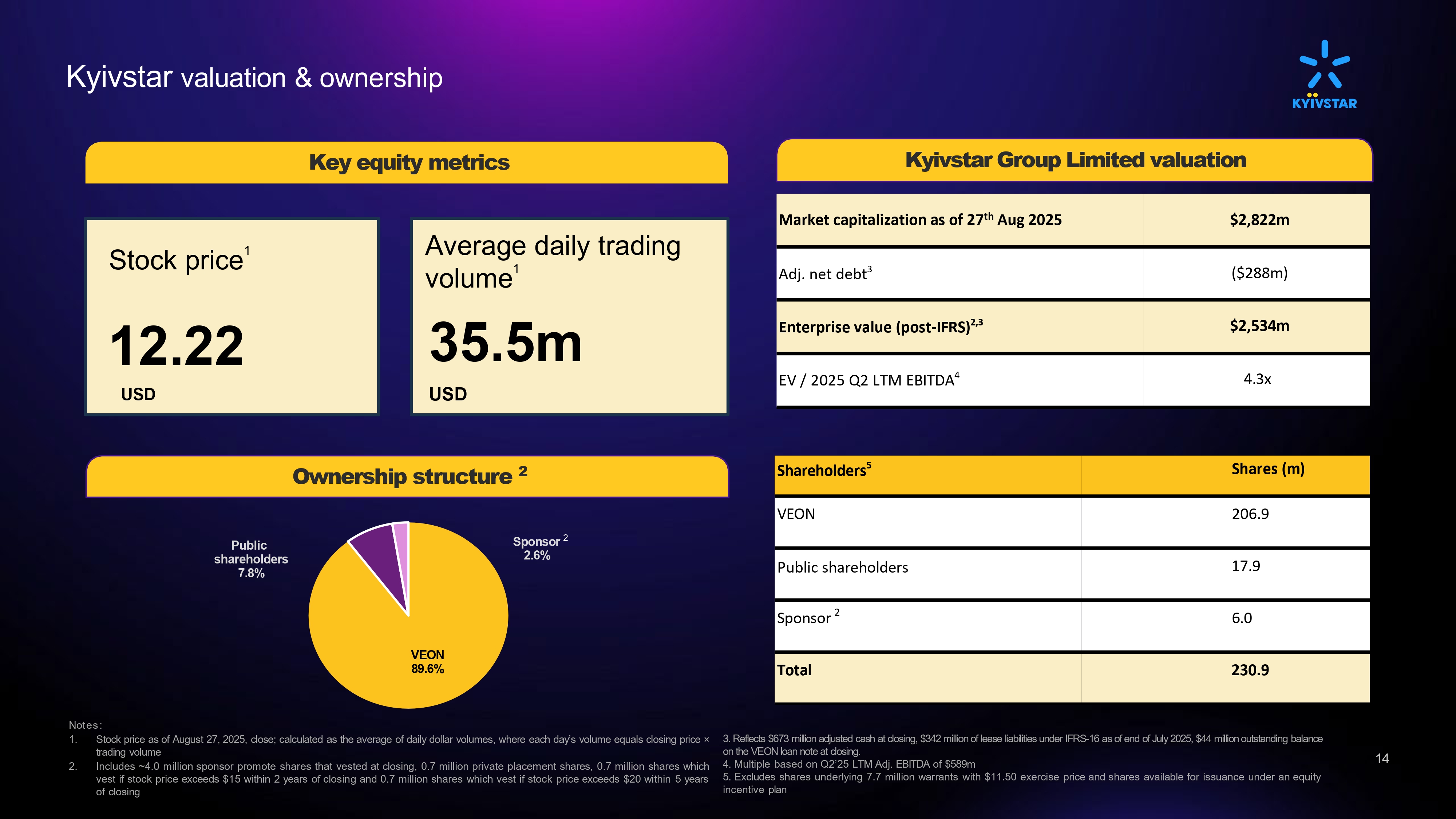 Ownership structure 2 Kyivstar Group Limited valuation Kyivstar valuation & ownership 14 Notes : 1. Stock price as of August 27 , 2025 , close ; calculated as the average of daily dollar volumes, where each day’s volume equals closing price î trading volume 2. Includes ~ 4 . 0 million sponsor promote shares that vested at closing, 0 . 7 million private placement shares, 0 . 7 million shares which vest if stock price exceeds $ 15 within 2 years of closing and 0 . 7 million shares which vest if stock price exceeds $ 20 within 5 years of closing 3. Includes $342 million of lease liabilities under IFRS - 16 and $44 million outstanding on the VEON loan note 4. Multiple based on Q2’25 LTM Adj. EBITDA of $589m 5. Excludes shares underlying 7.7 million warrants with $11.50 exercise price and shares available for issuance under an equity incentive plan VEON 89.6% Sponsor 2 2.6% Public shareholders 7.8% $2,822m Market capitalization ($288m) Adj. net debt 3 $2,534m Enterprise value (post - IFRS) 2,3 4.3x EV / 2025 Q2 LTM EBITDA 4 Key equity metrics Shares (m) Shareholders 5 206.9 VEON 17.9 Public shareholders 6.0 Sponsor 2 230.9 Total Average daily trading volume 1 35.5m USD Stock price 1 12.22 USD