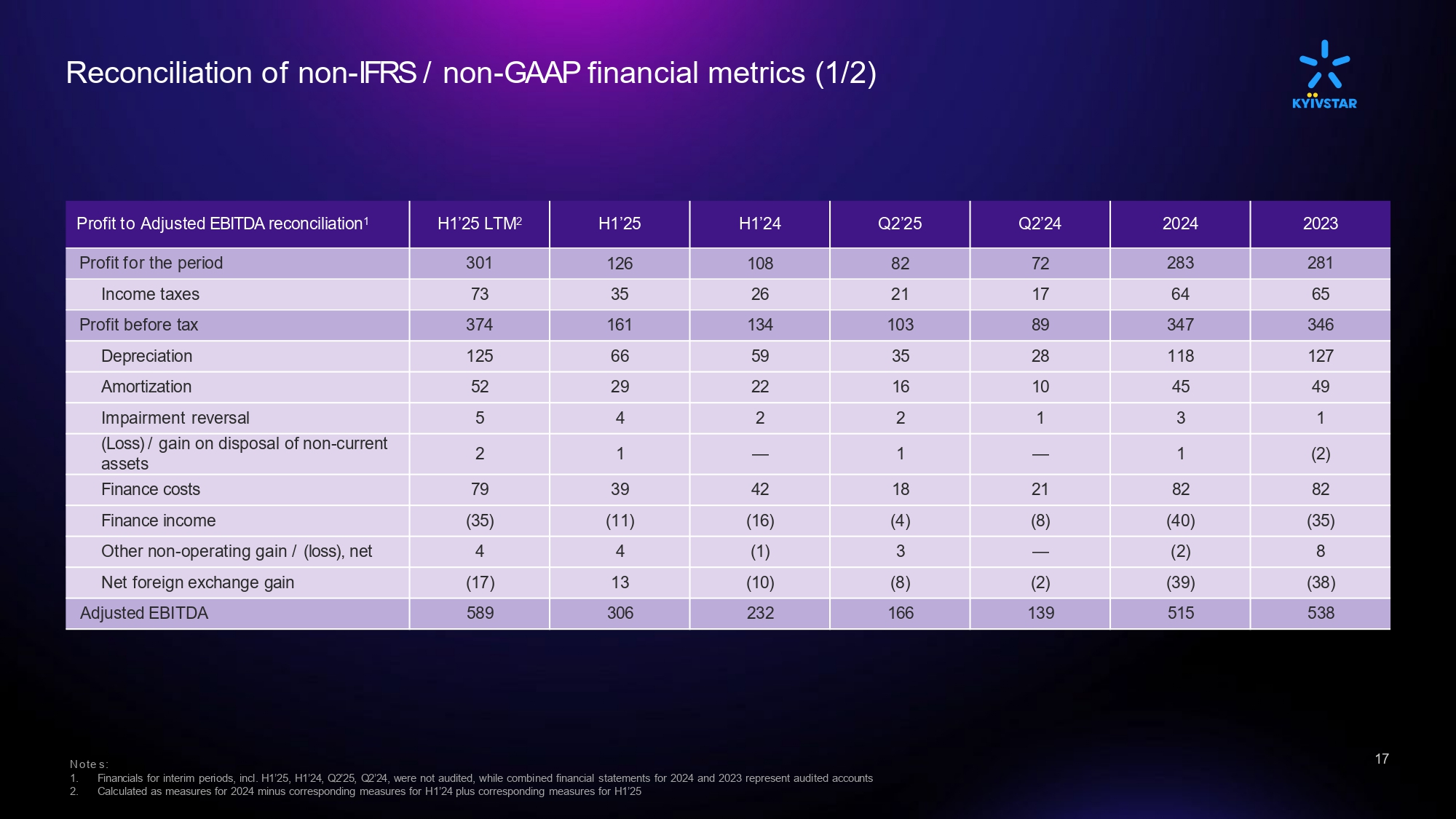 3.6 5.8 5.5 6.9 Q1'24 Q2'25 106.6 143.2 H1'25 7.1 9.4 10.6 11.8 Q1'24 Q1'25 Q2'24 Q2'25 5.3 6.5 H1'24 H1'25 H1'24 • H1’25 financial performance on the back of continuing war reflects Kyivstar’s superior positioning and is largely driven by 27% growth (y - o - y) in ARPU which includes the impact of customer loyalty measures taken in Q1'24 following a cyber security incident at the end of 2023, which lowered revenue in Q1'24 by an estimated UAH 1.4bn ($46m) in value • 37% growth in revenue in UAH in H1’25 y - o - y (23% YoY adjusted for the cyberattack impact in H1‘24) • 41 % growth in Adj . EBITDA in UAH in H 1 ’ 25 ( 17 % YoY adjusted for the cyberattack impact in H 1 ‘ 24 ) • H1’25 LTM Revenue increased to $1,037m while H1’25 LTM EBITDA grew to $589m resulting in 57% Adj. EBITDA margin (vs. 56% in full year 2024) 3 • Balance sheet reflects a resilient, well - capitalized business with strong liquidity, minimal leverage, and capacity for reinvestment. 3.4 2.7 +34% 13 Q2 / H1 2025 trading update Kyivstar’s financials show a robust first half of 2025 N o te s : 1. Translated to US$ at period - avg UAH/US$ NBU FX rates: 38.20 (Q1’24), 39.85 (Q2’24), 39.01 (H1’24), 41.76 (Q1’25), 41.51 (Q2’25), 41.63 (H1’25), 41.46 (Jun’25 LTM) 2. MAU – Monthly Active Users 3. H1’25 LTM values calculated as 2024 measures minus corresponding measures for H1’24 plus corresponding measures for H1’25. Revenue (UAH bn) Adj. EBITDA (UAH bn) Commentary Total multiplay users (MAU 2 , eop), m Q1'25 Q2'24 Monthly ARPU (period - avg), UAH +24% US$ 1 H1’24 421 US$m 1 UAHbn 1 16.4 H1’25 539 22.4 +28% +37% H1’25 306 12.7 H1’24 232 9.1 +32% +41%