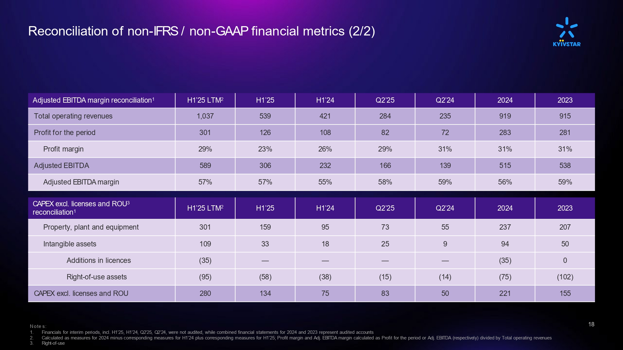 Reconciliation of non - IFRS / non - GAAP financial metrics (1/2) 17 2023 2024 Q2’24 Q2’25 H1’24 H1’25 H1’25 LTM 2 Profit to Adjusted EBITDA reconciliation 1 281 283 72 82 108 126 301 Profit for the period 65 64 17 21 26 35 73 Income taxes 346 347 89 103 134 161 374 Profit before tax 127 118 28 35 59 66 125 Depreciation 49 45 10 16 22 29 52 Amortization 1 3 1 2 2 4 5 Impairment reversal (2) 1 — 1 — 1 2 (Loss) / gain on disposal of non - current assets 82 82 21 18 42 39 79 Finance costs (35) (40) (8) (4) (16) (11) (35) Finance income 8 (2) — 3 (1) 4 4 Other non - operating gain / (loss), net (38) (39) (2) (8) (10) 13 (17) Net foreign exchange gain 538 515 139 166 232 306 589 Adjusted EBITDA N o te s : 1. Financials for interim periods, incl. H1’25, H1’24, Q2’25, Q2’24, were not audited, while combined financial statements for 2024 and 2023 represent audited accounts 2. Calculated as measures for 2024 minus corresponding measures for H1’24 plus corresponding measures for H1’25