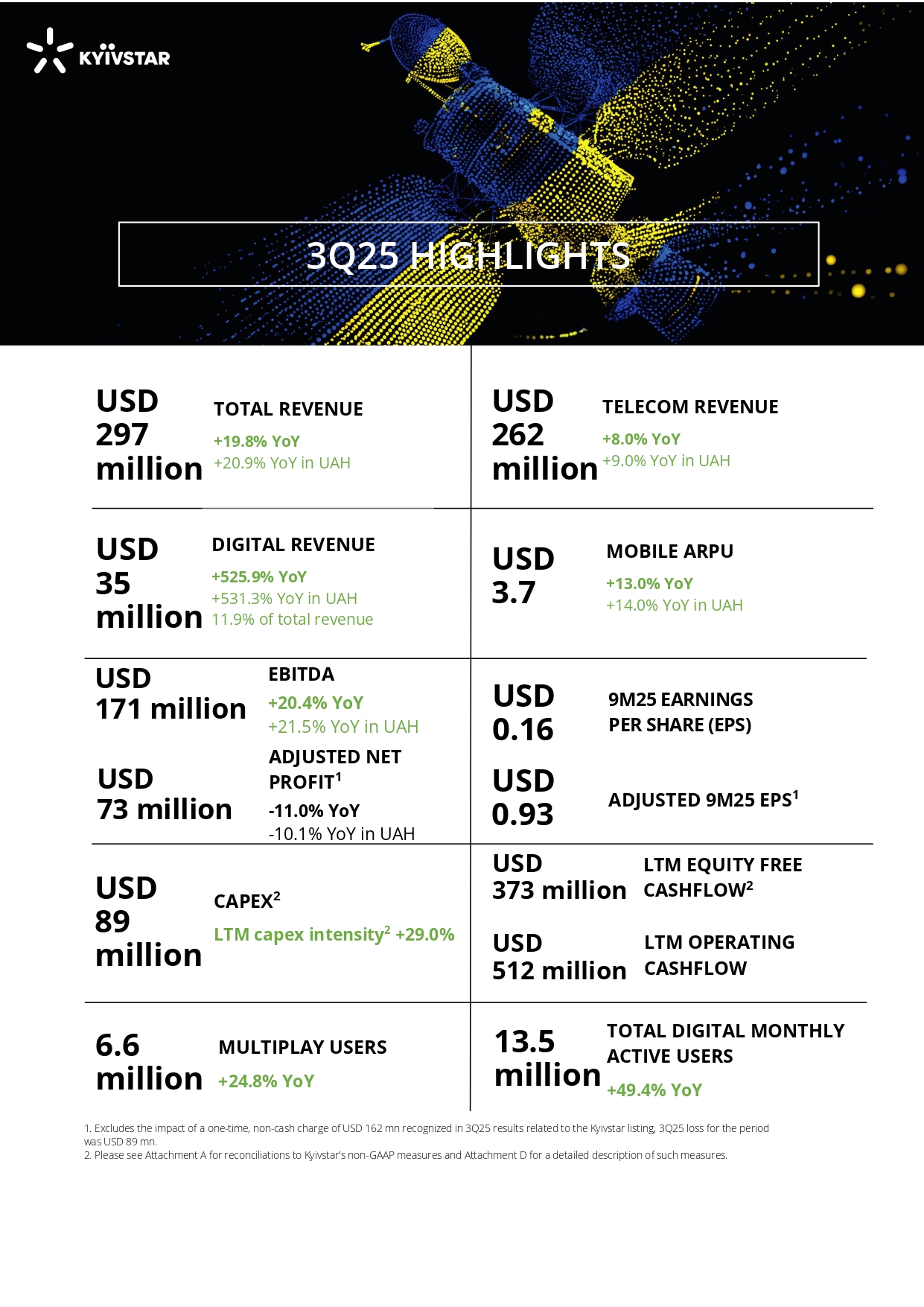 1.Adjusted figures for 3Q25 exclude the impact of a one-time, non-cash charge of $162 mn (UAH 6.7bn) recognized in 3Q25 results related to the Kyivstar listing, 3Q25 loss for the period was USD 89 mn.