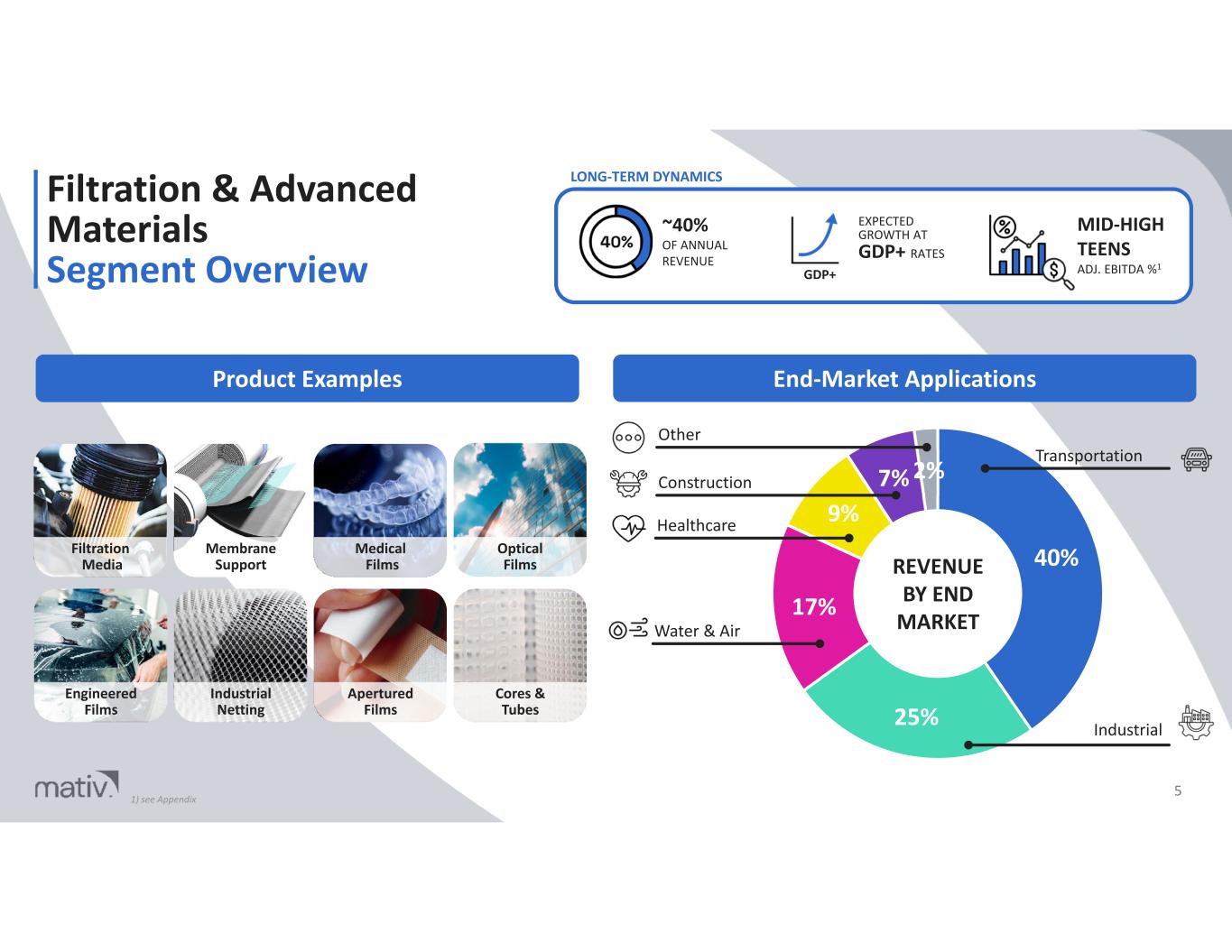 Mativ At A Glance $2.0B TTM REVENUE $209M TTM ADJUSTED EBITDA 5,000 EMPLOYEES 90+ COUNTRIES SERVED ~60% AMERICAS ~30% EMEA ~10% APAC FAM Filtration & Advanced Materials SAS Sustainable & Adhesive Solutions 4 64% Filtration & Netting 36% Advanced Films 48% Tapes, Labels & Liners 26% Paper & Packaging 26% Healthcare & Other BY P RO DU CT C AT EG OR Y BY P RO DU CT C AT EG OR Y 38% Net Sales 62% Net Sales 45% Adj. EBITDA 55% Adj. EBITDA • All financials shown are on a trailing-twelve-month basis as of Q1 FY25 • TTM Adjusted EBITDA is a non-GAAP financial measure. For a reconciliation of GAAP to non-GAAP financial metrics, see Appendix.