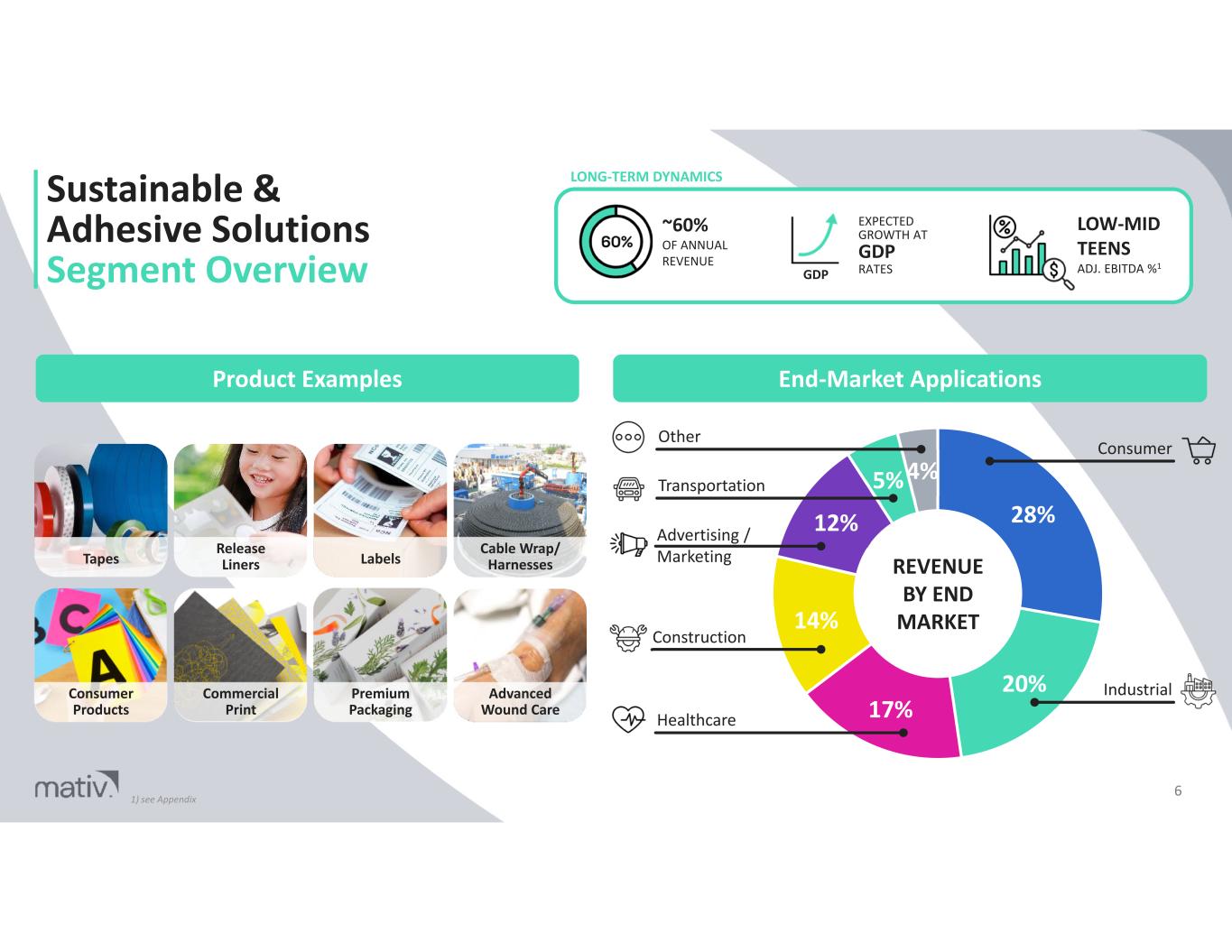 40% 25% 17% 9% 7% 2% Filtration & Advanced Materials Segment Overview 5 ~40% OF ANNUAL REVENUE MID-HIGH TEENS ADJ. EBITDA %1 EXPECTED GROWTH AT GDP+ RATES Cores & Tubes Apertured Films Industrial Netting Engineered Films Optical Films Medical Films Membrane Support Filtration Media REVENUE BY END MARKET Product Examples End-Market Applications Transportation Industrial Water & Air Healthcare Other GDP+ Construction LONG-TERM DYNAMICS 1) see Appendix