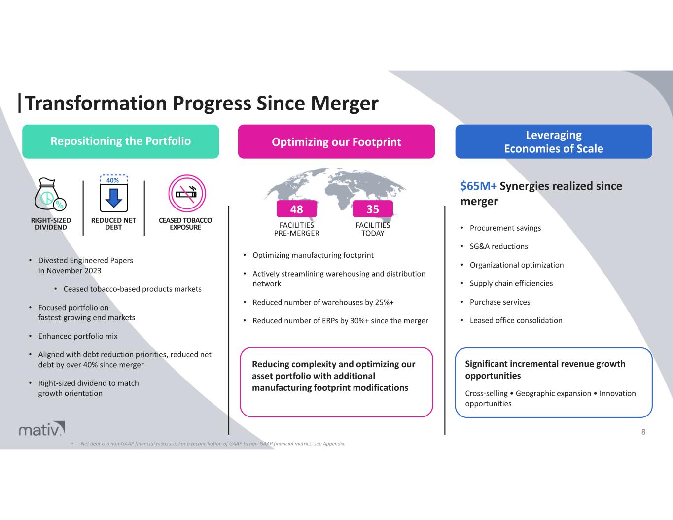 Customer Value Chain 7 • Purification • Durability • Strength • Printability • Safety • Adhesion • Resistance • Longevity Chemicals Fibers Polymers Resins Netting Nonwovens Films Specialty Paper Converting Coating Saturation Adhesives We combine raw materials to create critical components that deliver essential performance for demanding applications to form trusted customer relationships HVAC/Air Filtration • Industrial Process • Filtration Life Sciences Transportation & Mobility • Smart Surfaces/IoT • Glass Laminations & Glazing Wind Turbines • Industrial Packaging • Infrastructure & Construction Demanding Applications