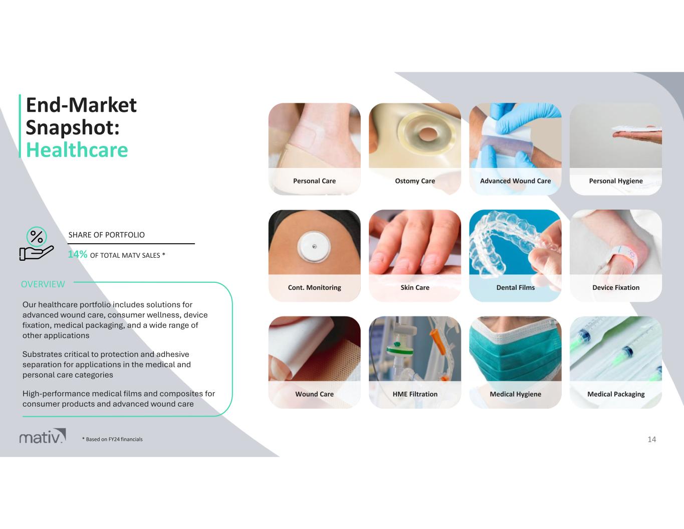 End-Market Snapshot: Healthcare Our healthcare portfolio includes solutions for advanced wound care, consumer wellness, device fixation, medical packaging, and a wide range of other applications Substrates critical to protection and adhesive separation for applications in the medical and personal care categories High-performance medical films and composites for consumer products and advanced wound care OVERVIEW 14% OF TOTAL MATV SALES * SHARE OF PORTFOLIO Personal Care 14 Ostomy Care Advanced Wound Care Personal Hygiene Cont. Monitoring Skin Care Dental Films Device Fixation Wound Care HME Filtration Medical Hygiene Medical Packaging * Based on FY24 financials