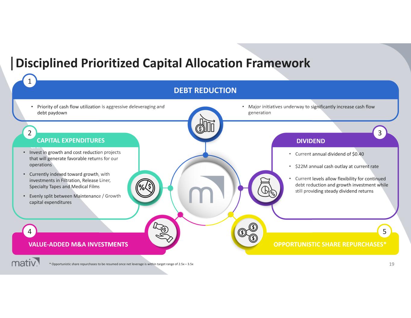 Disciplined Prioritized Capital Allocation Framework 19 OPPORTUNISTIC SHARE REPURCHASES*VALUE-ADDED M&A INVESTMENTS DEBT REDUCTION • Priority of cash flow utilization is aggressive deleveraging and debt paydown • Major initiatives underway to significantly increase cash flow generation DIVIDEND • Current annual dividend of $0.40 • $22M annual cash outlay at current rate • Current levels allow flexibility for continued debt reduction and growth investment while still providing steady dividend returns CAPEX AT 3-4% OF REVENUE • Invest in growth and cost reduction projects that will generate favorable returns for our operations • Currently indexed toward growth, with investments in Filtration, Release Liner, Specialty Tapes and Medical Films • Evenly split between Maintenance / Growth capital expenditures CAPITAL EXPENDITURES 1 2 3 4 5 * Opportunistic share repurchases to be resumed once net leverage is within target range of 2.5x – 3.5x
