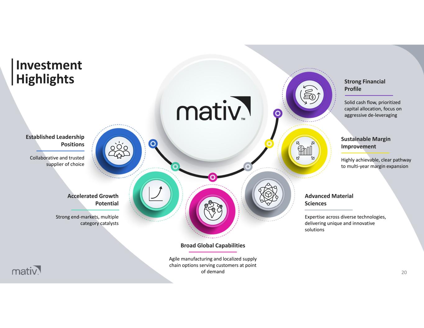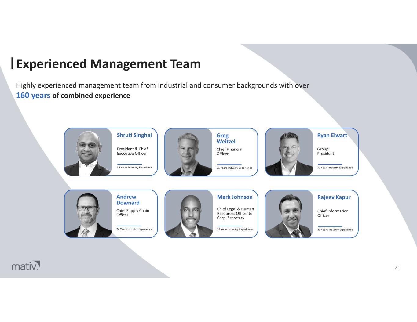 Investment Highlights 20 Established Leadership Positions Collaborative and trusted supplier of choice Accelerated Growth Potential Strong end-markets, multiple category catalysts Advanced Material Sciences Expertise across diverse technologies, delivering unique and innovative solutions Broad Global Capabilities Agile manufacturing and localized supply chain options serving customers at point of demand Sustainable Margin Improvement Highly achievable, clear pathway to multi-year margin expansion Strong Financial Profile Solid cash flow, prioritized capital allocation, focus on aggressive de-leveraging