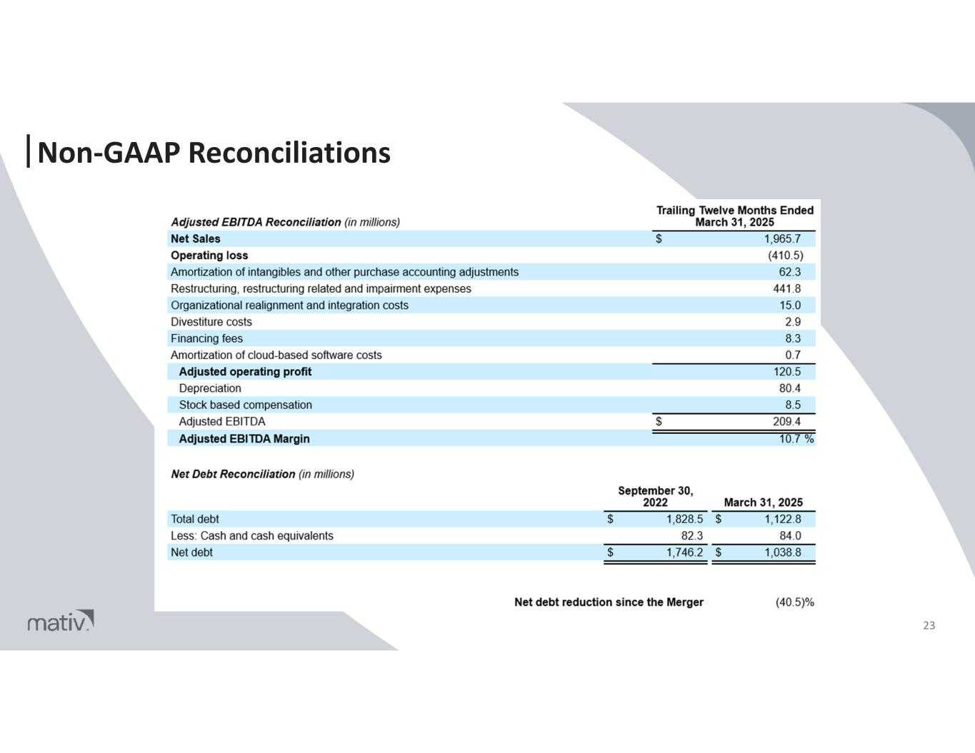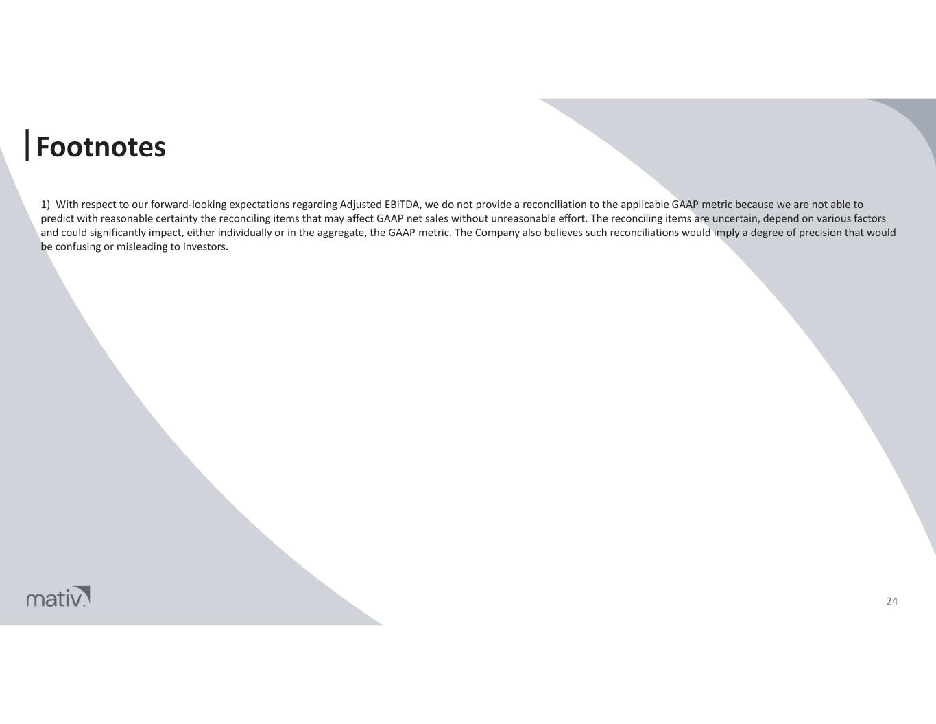 Footnotes 24 1) With respect to our forward-looking expectations regarding Adjusted EBITDA, we do not provide a reconciliation to the applicable GAAP metric because we are not able to predict with reasonable certainty the reconciling items that may affect GAAP net sales without unreasonable effort. The reconciling items are uncertain, depend on various factors and could significantly impact, either individually or in the aggregate, the GAAP metric. The Company also believes such reconciliations would imply a degree of precision that would be confusing or misleading to investors.