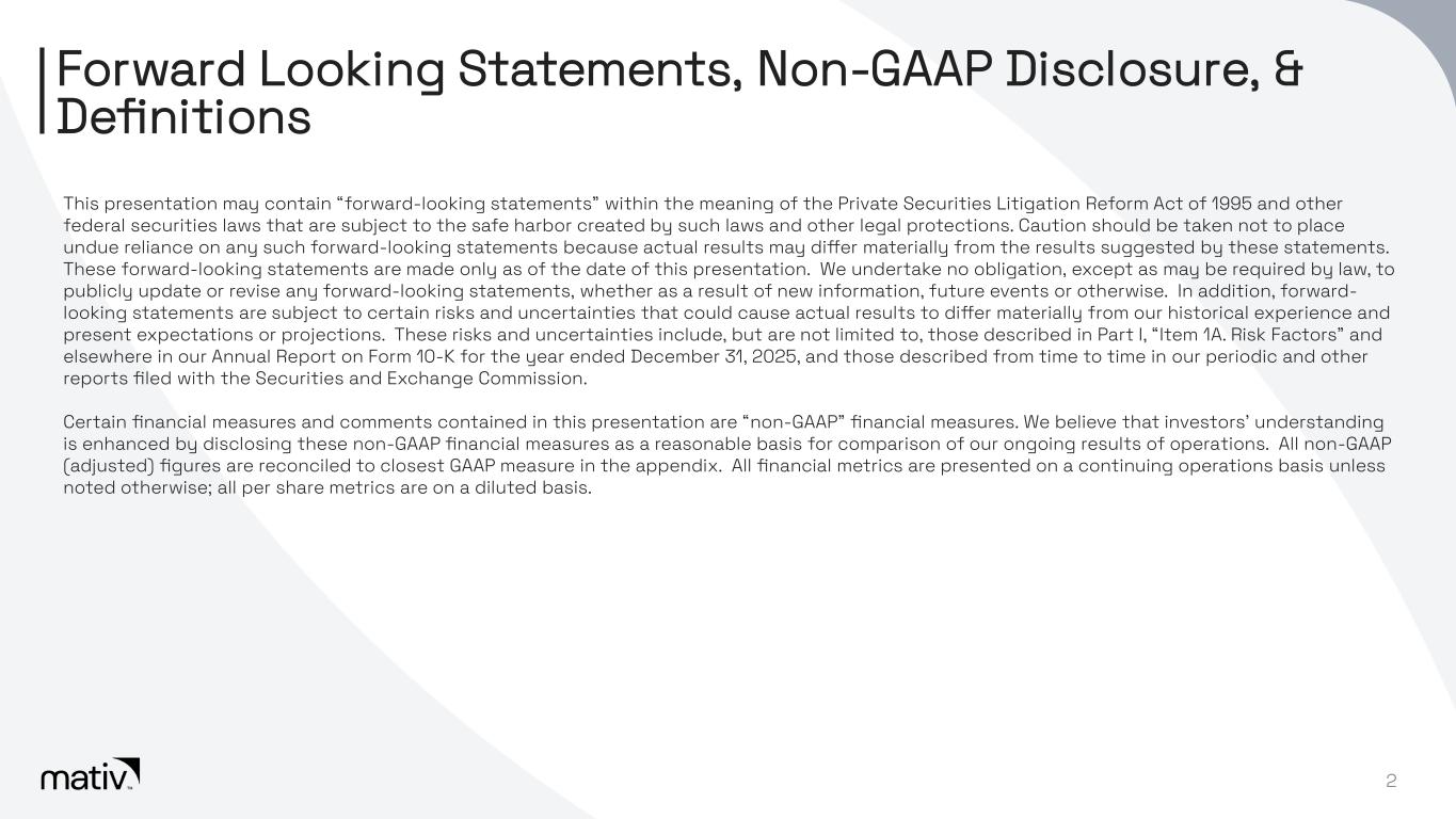 Forward Looking Statements, Non-GAAP Disclosure, & Definitions 2 This presentation may contain “forward-looking statements” within the meaning of the Private Securities Litigation Reform Act of 1995 and other federal securities laws that are subject to the safe harbor created by such laws and other legal protections. Caution should be taken not to place undue reliance on any such forward-looking statements because actual results may differ materially from the results suggested by these statements. These forward-looking statements are made only as of the date of this presentation. We undertake no obligation, except as may be required by law, to publicly update or revise any forward-looking statements, whether as a result of new information, future events or otherwise. In addition, forward- looking statements are subject to certain risks and uncertainties that could cause actual results to differ materially from our historical experience and present expectations or projections. These risks and uncertainties include, but are not limited to, those described in Part I, “Item 1A. Risk Factors” and elsewhere in our Annual Report on Form 10-K for the year ended December 31, 2025, and those described from time to time in our periodic and other reports filed with the Securities and Exchange Commission. Certain financial measures and comments contained in this presentation are “non-GAAP” financial measures. We believe that investors’ understanding is enhanced by disclosing these non-GAAP financial measures as a reasonable basis for comparison of our ongoing results of operations. All non-GAAP (adjusted) figures are reconciled to closest GAAP measure in the appendix. All financial metrics are presented on a continuing operations basis unless noted otherwise; all per share metrics are on a diluted basis.