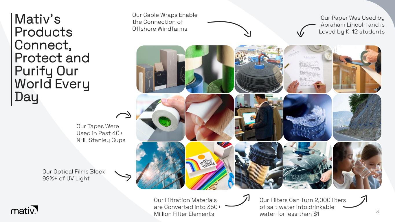 Mativ’s Products Connect, Protect and Purify Our World Every Day Our Cable Wraps Enable the Connection of Offshore Windfarms Our Paper Was Used by Abraham Lincoln and is Loved by K-12 students Our Tapes Were Used in Past 40+ NHL Stanley Cups Our Optical Films Block 99%+ of UV Light Our Filtration Materials are Converted into 350+ Million Filter Elements 3 Our Filters Can Turn 2,000 liters of salt water into drinkable water for less than $1