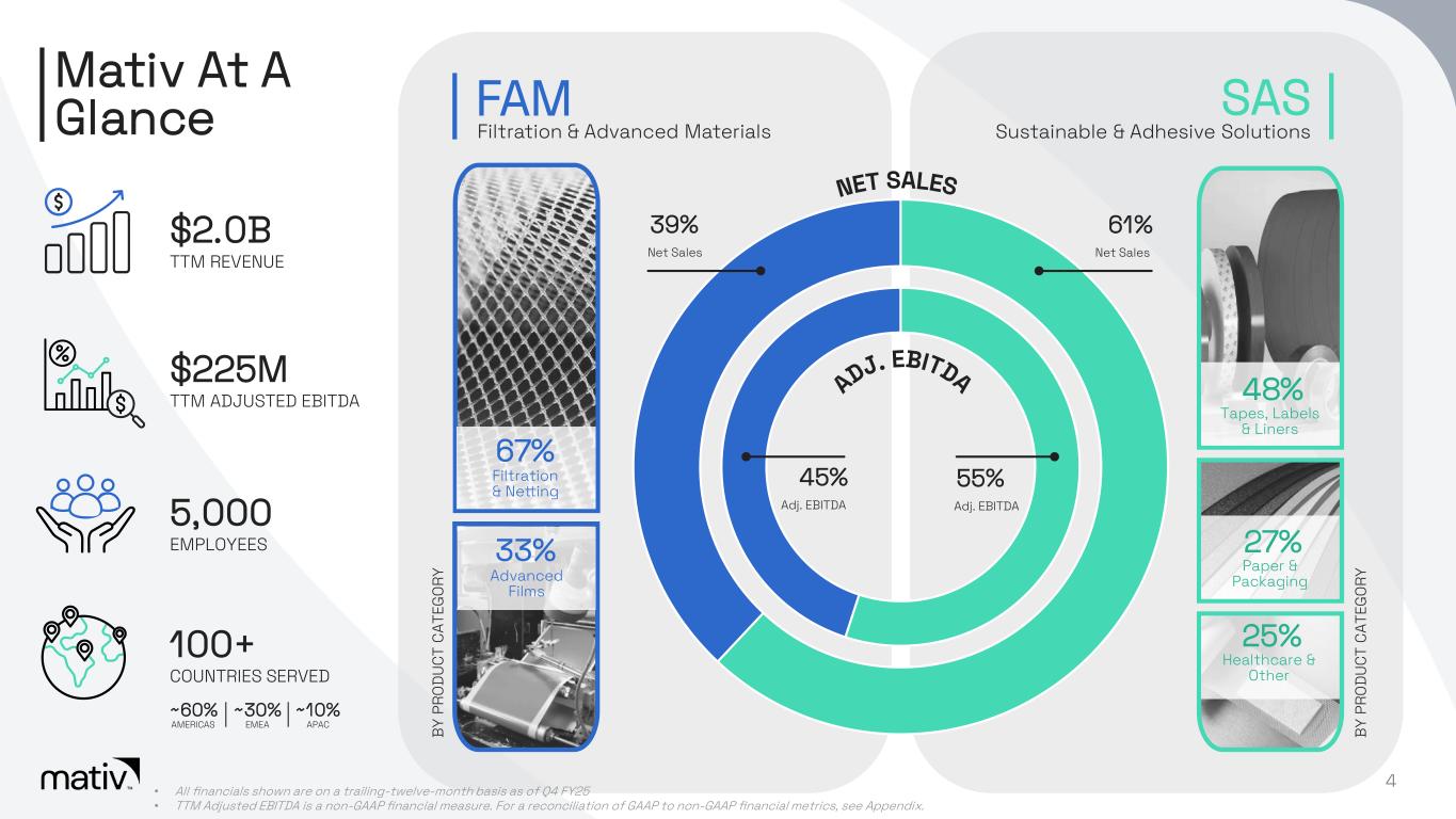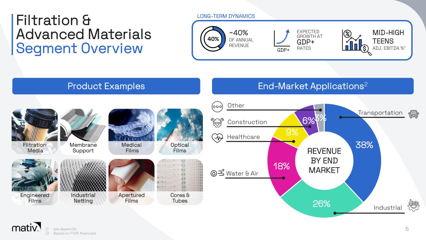 Mativ At A Glance $2.0B TTM REVENUE $225M TTM ADJUSTED EBITDA 5,000 EMPLOYEES 100+ COUNTRIES SERVED ~60% AMERICAS ~30% EMEA ~10% APAC FAM Filtration & Advanced Materials SAS Sustainable & Adhesive Solutions 4 67% Filtration & Netting 33% Advanced Films 48% Tapes, Labels & Liners 27% Paper & Packaging 25% Healthcare & Other BY P RO DU CT C AT EG OR Y BY P RO DU CT C AT EG OR Y 39% Net Sales 61% Net Sales 45% Adj. EBITDA 55% Adj. EBITDA • All financials shown are on a trailing-twelve-month basis as of Q4 FY25 • TTM Adjusted EBITDA is a non-GAAP financial measure. For a reconciliation of GAAP to non-GAAP financial metrics, see Appendix.