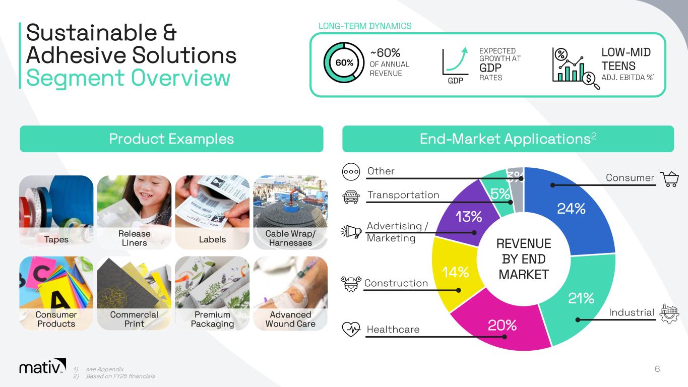 38% 26% 18% 9% 6%3% Filtration & Advanced Materials Segment Overview 5 ~40% OF ANNUAL REVENUE MID-HIGH TEENS ADJ. EBITDA %1 EXPECTED GROWTH AT GDP+ RATES Cores & Tubes Apertured Films Industrial Netting Engineered Films Optical Films Medical Films Membrane Support Filtration Media REVENUE BY END MARKET Product Examples End-Market Applications2 Transportation Industrial Water & Air Healthcare Other GDP+ Construction LONG-TERM DYNAMICS 1) see Appendix 2) Based on FY25 financials