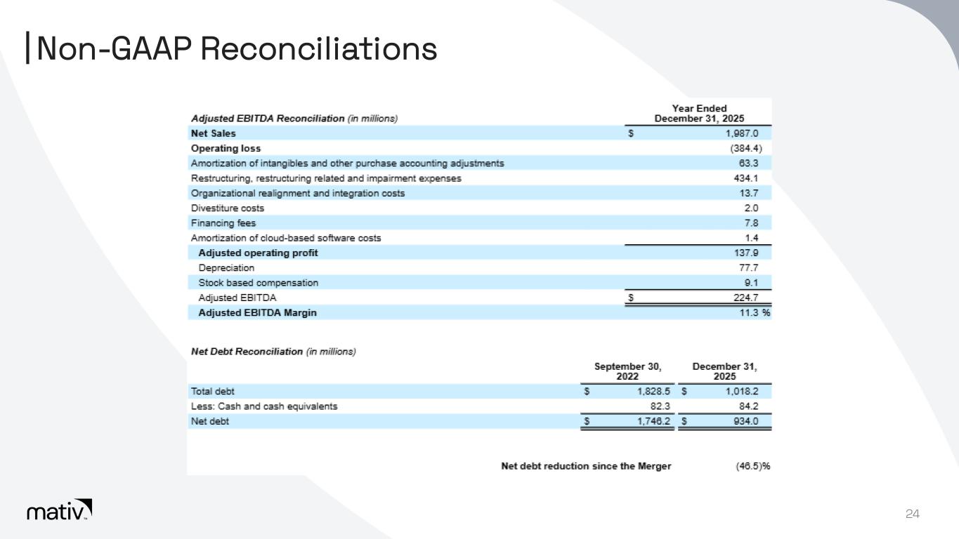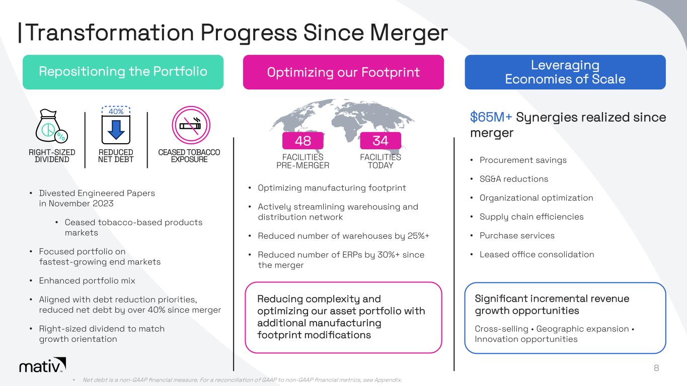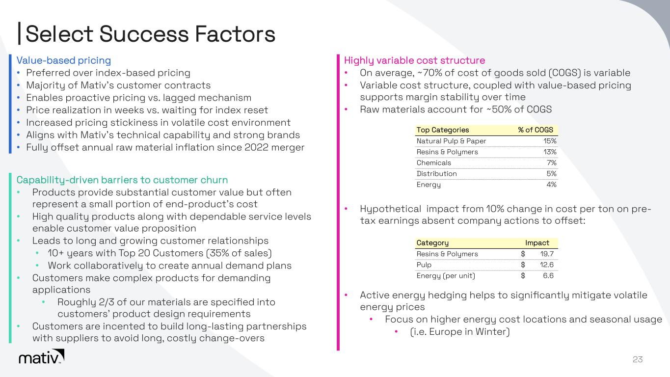 Select Success Factors 23 Value-based pricing • Preferred over index-based pricing • Majority of Mativ’s customer contracts • Enables proactive pricing vs. lagged mechanism • Price realization in weeks vs. waiting for index reset • Increased pricing stickiness in volatile cost environment • Aligns with Mativ’s technical capability and strong brands • Fully offset annual raw material inflation since 2022 merger Capability-driven barriers to customer churn • Products provide substantial customer value but often represent a small portion of end-product’s cost • High quality products along with dependable service levels enable customer value proposition • Leads to long and growing customer relationships • 10+ years with Top 20 Customers (35% of sales) • Work collaboratively to create annual demand plans • Customers make complex products for demanding applications • Roughly 2/3 of our materials are specified into customers’ product design requirements • Customers are incented to build long-lasting partnerships with suppliers to avoid long, costly change-overs Highly variable cost structure • On average, ~70% of cost of goods sold (COGS) is variable • Variable cost structure, coupled with value-based pricing supports margin stability over time • Raw materials account for ~50% of COGS • Hypothetical impact from 10% change in cost per ton on pre- tax earnings absent company actions to offset: • Active energy hedging helps to significantly mitigate volatile energy prices • Focus on higher energy cost locations and seasonal usage • (i.e. Europe in Winter) Category Impact Resins & Polymers 19.7$ Pulp 12.6$ Energy (per unit) 6.6$ Top Categories % of COGS Natural Pulp & Paper 15% Resins & Polymers 13% Chemicals 7% Distribution 5% Energy 4%
