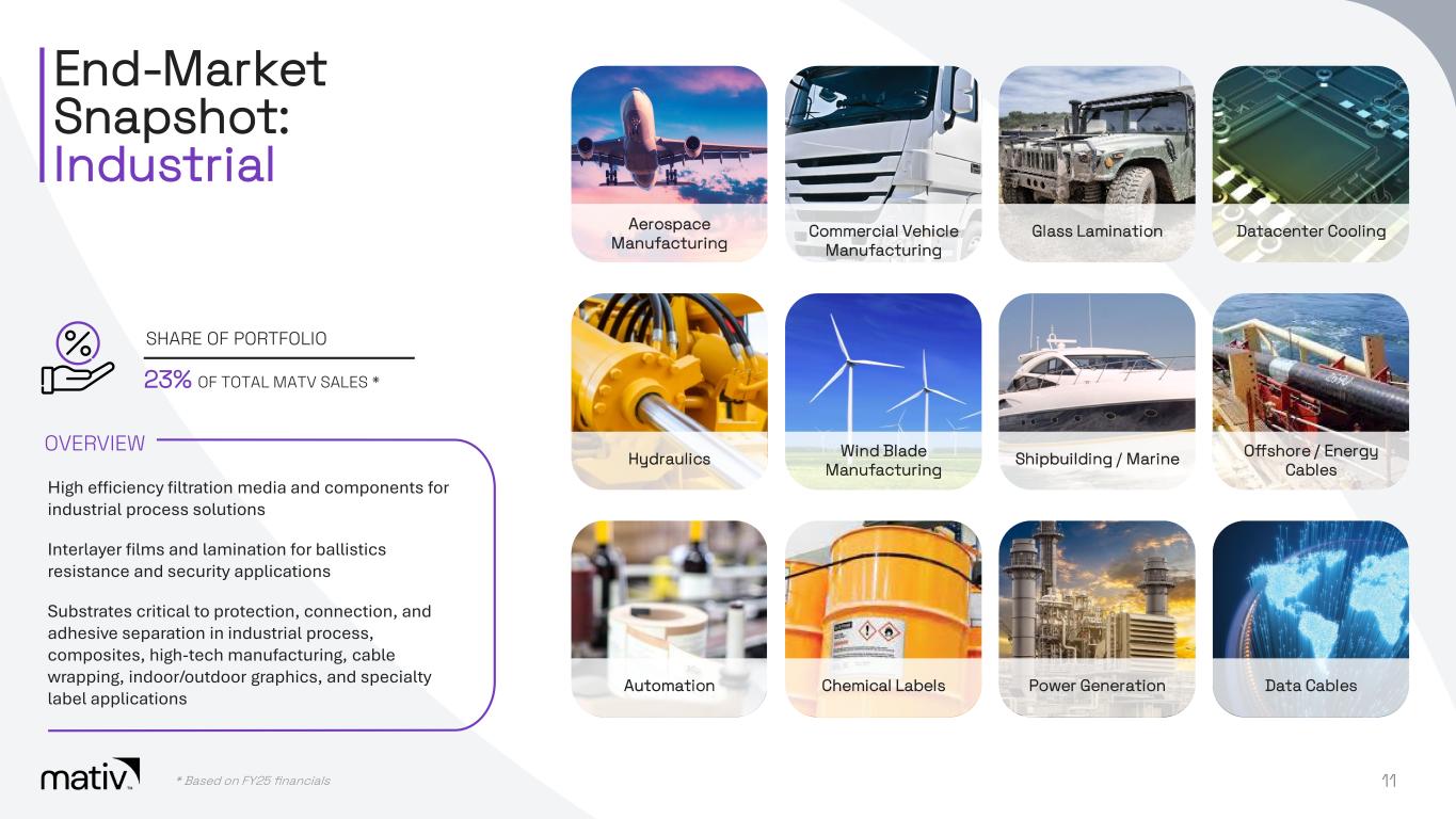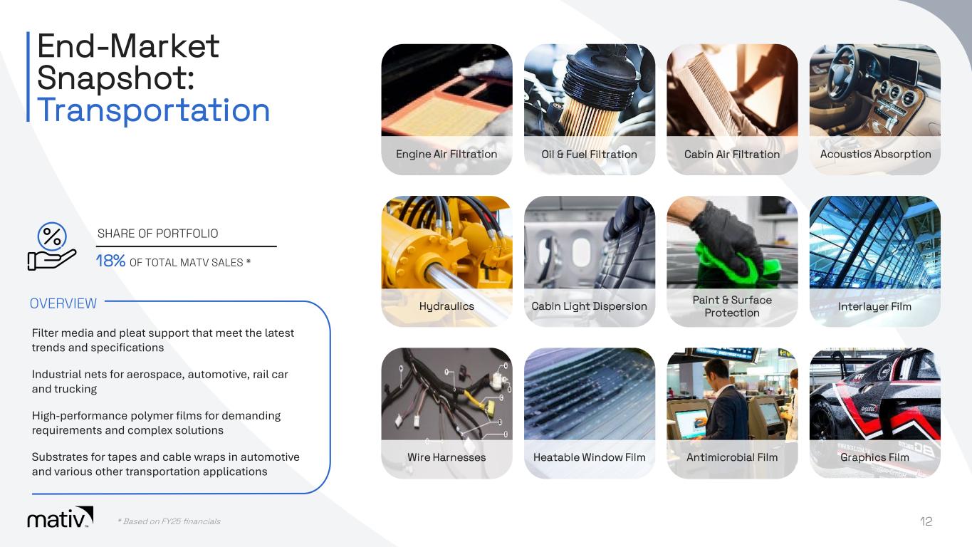 End-Market Snapshot: Industrial 11 High efficiency filtration media and components for industrial process solutions Interlayer films and lamination for ballistics resistance and security applications Substrates critical to protection, connection, and adhesive separation in industrial process, composites, high-tech manufacturing, cable wrapping, indoor/outdoor graphics, and specialty label applications OVERVIEW 23% OF TOTAL MATV SALES * SHARE OF PORTFOLIO Aerospace Manufacturing Commercial Vehicle Manufacturing Glass Lamination Datacenter Cooling Hydraulics Wind Blade Manufacturing Shipbuilding / Marine Offshore / Energy Cables Automation Chemical Labels Power Generation Data Cables * Based on FY25 financials