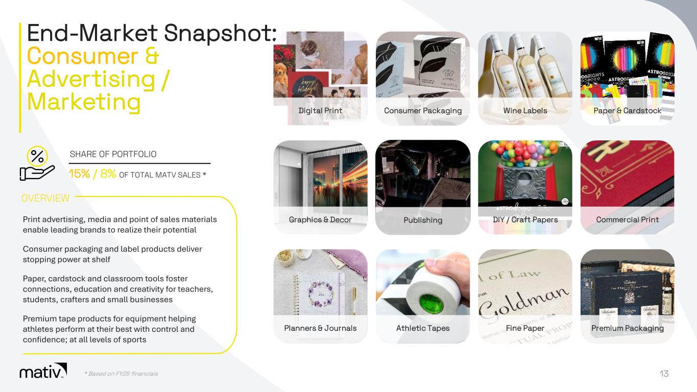 End-Market Snapshot: Transportation 12 Engine Air Filtration Oil & Fuel Filtration Cabin Air Filtration Acoustics Absorption Hydraulics Cabin Light Dispersion Paint & Surface Protection Interlayer Film Wire Harnesses Heatable Window Film Antimicrobial Film Graphics Film 18% OF TOTAL MATV SALES * SHARE OF PORTFOLIO Filter media and pleat support that meet the latest trends and specifications Industrial nets for aerospace, automotive, rail car and trucking High-performance polymer films for demanding requirements and complex solutions Substrates for tapes and cable wraps in automotive and various other transportation applications OVERVIEW * Based on FY25 financials