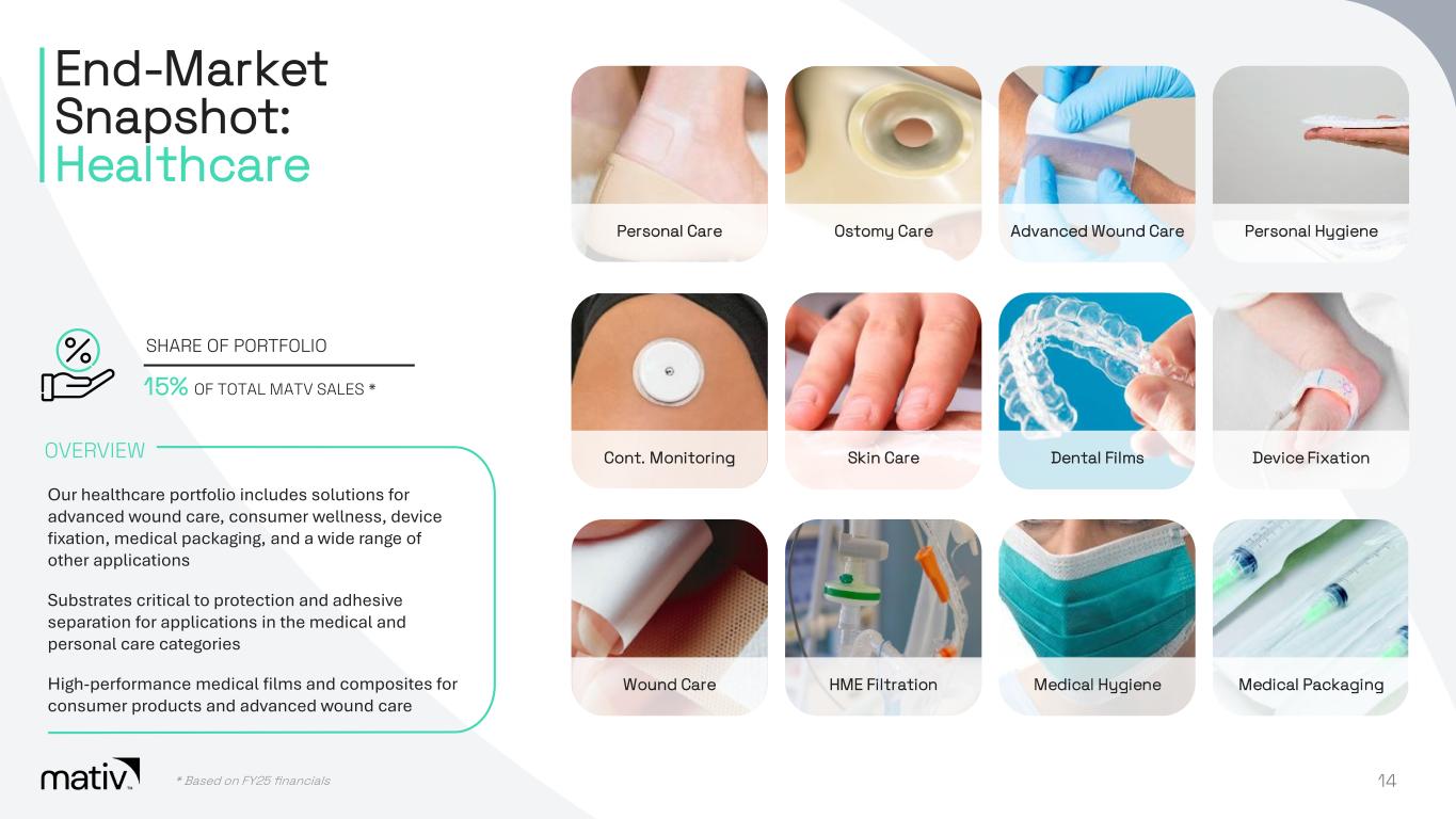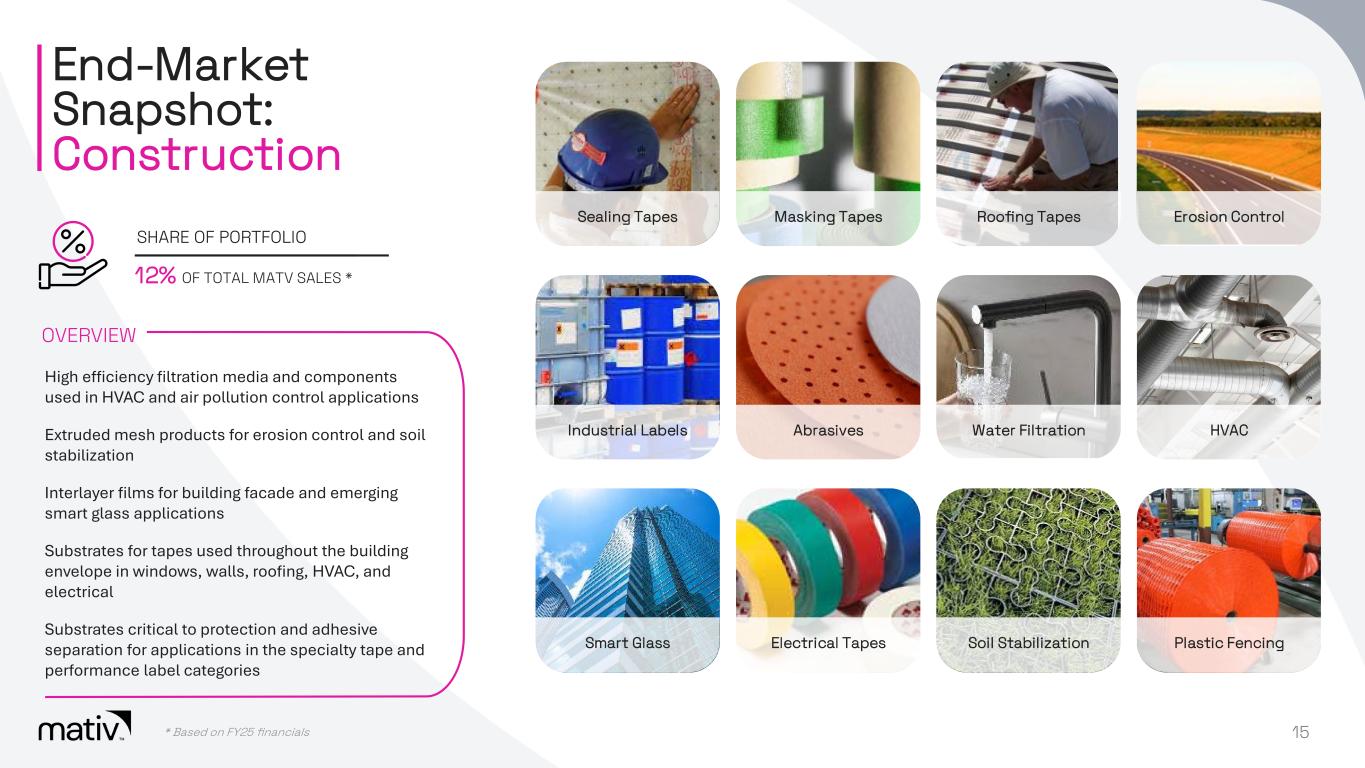 End-Market Snapshot: Healthcare Our healthcare portfolio includes solutions for advanced wound care, consumer wellness, device fixation, medical packaging, and a wide range of other applications Substrates critical to protection and adhesive separation for applications in the medical and personal care categories High-performance medical films and composites for consumer products and advanced wound care OVERVIEW 15% OF TOTAL MATV SALES * SHARE OF PORTFOLIO Personal Care 14 Ostomy Care Advanced Wound Care Personal Hygiene Cont. Monitoring Skin Care Dental Films Device Fixation Wound Care HME Filtration Medical Hygiene Medical Packaging * Based on FY25 financials
