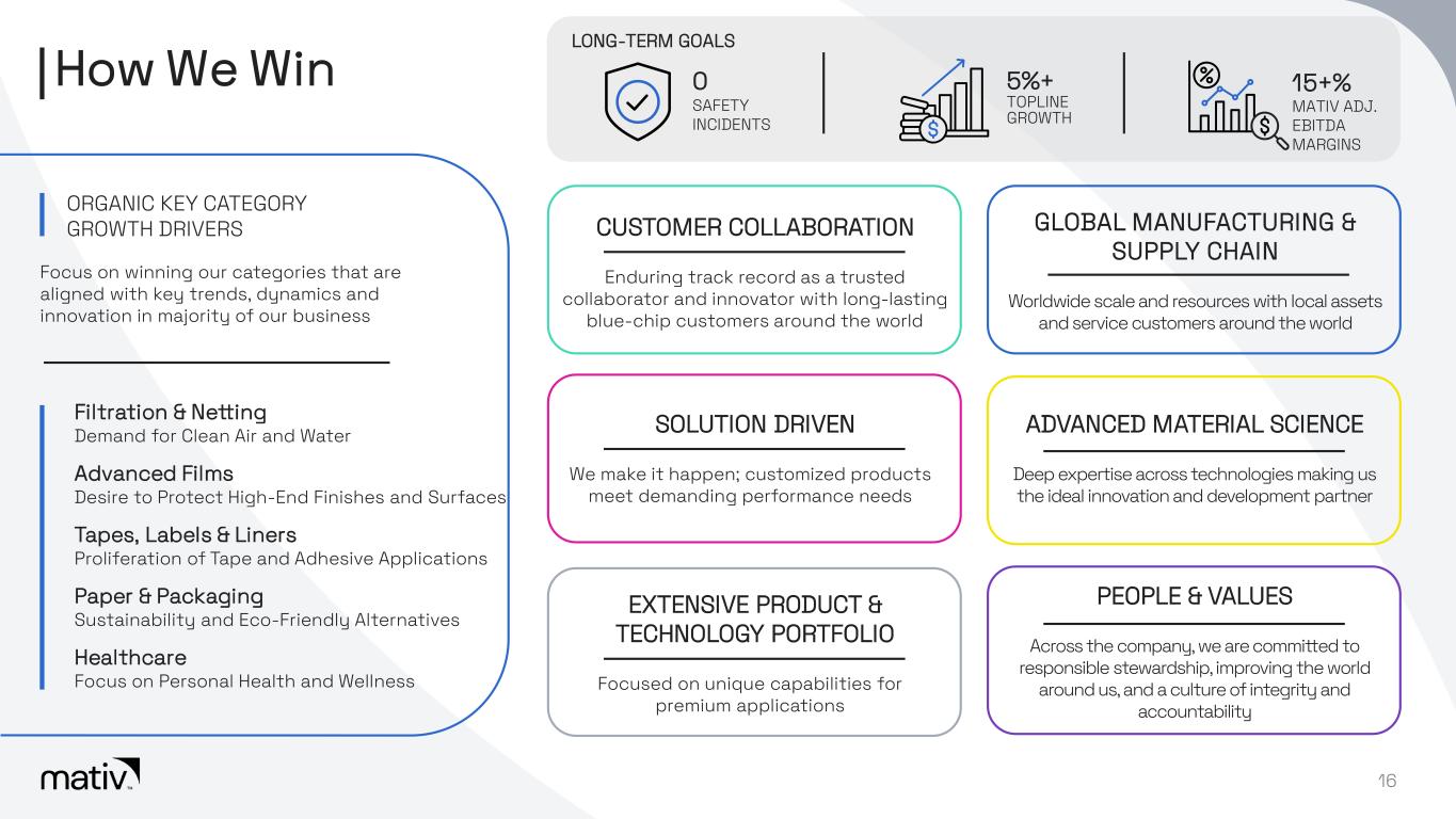 End-Market Snapshot: Construction 15 12% OF TOTAL MATV SALES * SHARE OF PORTFOLIO High efficiency filtration media and components used in HVAC and air pollution control applications Extruded mesh products for erosion control and soil stabilization Interlayer films for building facade and emerging smart glass applications Substrates for tapes used throughout the building envelope in windows, walls, roofing, HVAC, and electrical Substrates critical to protection and adhesive separation for applications in the specialty tape and performance label categories OVERVIEW Sealing Tapes Masking Tapes Roofing Tapes Erosion Control Industrial Labels Abrasives Water Filtration HVAC Smart Glass Electrical Tapes Soil Stabilization Plastic Fencing * Based on FY25 financials