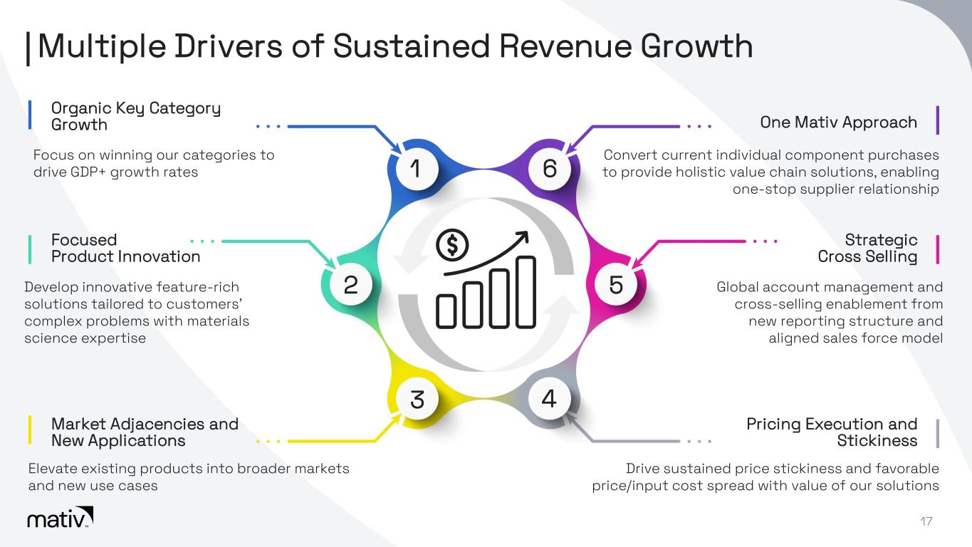 How We Win 16 0 SAFETY INCIDENTS 15+% MATIV ADJ. EBITDA MARGINS 5%+ TOPLINE GROWTH Focus on winning our categories that are aligned with key trends, dynamics and innovation in majority of our business Filtration & Netting Demand for Clean Air and Water Advanced Films Desire to Protect High-End Finishes and Surfaces Tapes, Labels & Liners Proliferation of Tape and Adhesive Applications Paper & Packaging Sustainability and Eco-Friendly Alternatives Healthcare Focus on Personal Health and Wellness CUSTOMER COLLABORATION Enduring track record as a trusted collaborator and innovator with long-lasting blue-chip customers around the world SOLUTION DRIVEN We make it happen; customized products meet demanding performance needs EXTENSIVE PRODUCT & TECHNOLOGY PORTFOLIO Focused on unique capabilities for premium applications GLOBAL MANUFACTURING & SUPPLY CHAIN Worldwide scale and resources with local assets and service customers around the world ADVANCED MATERIAL SCIENCE Deep expertise across technologies making us the ideal innovation and development partner PEOPLE & VALUES Across the company, we are committed to responsible stewardship, improving the world around us, and a culture of integrity and accountability ORGANIC KEY CATEGORY GROWTH DRIVERS LONG-TERM GOALS