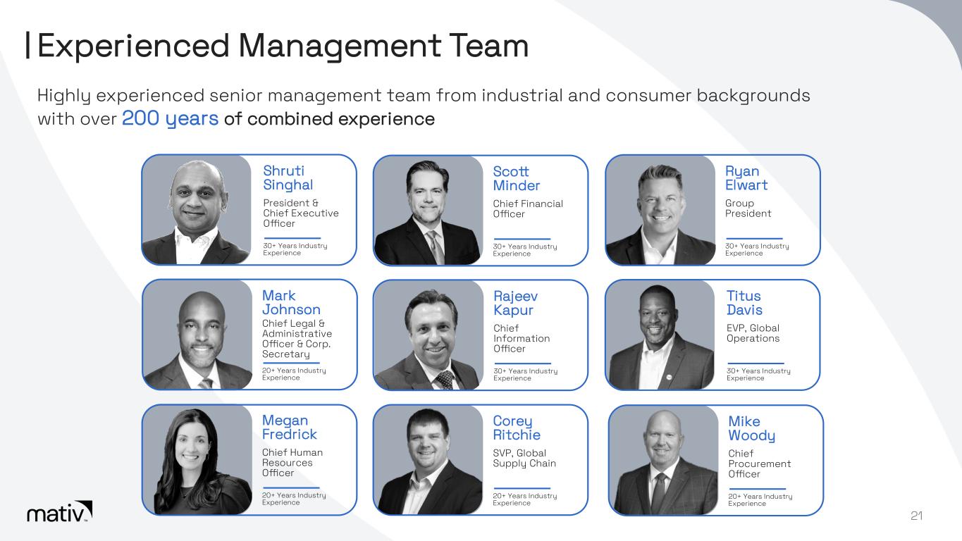 Experienced Management Team 21 Highly experienced senior management team from industrial and consumer backgrounds with over 200 years of combined experience Ryan Elwart Group President 30+ Years Industry Experience Mark Johnson Chief Legal & Administrative Officer & Corp. Secretary 20+ Years Industry Experience Rajeev Kapur Chief Information Officer 30+ Years Industry Experience Shruti Singhal President & Chief Executive Officer 30+ Years Industry Experience Titus Davis EVP, Global Operations 30+ Years Industry Experience Mike Woody Chief Procurement Officer 20+ Years Industry Experience Corey Ritchie SVP, Global Supply Chain 20+ Years Industry Experience Scott Minder Chief Financial Officer 30+ Years Industry Experience Megan Fredrick Chief Human Resources Officer 20+ Years Industry Experience