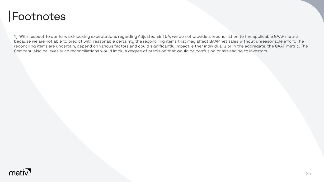 Footnotes 25 1) With respect to our forward-looking expectations regarding Adjusted EBITDA, we do not provide a reconciliation to the applicable GAAP metric because we are not able to predict with reasonable certainty the reconciling items that may affect GAAP net sales without unreasonable effort. The reconciling items are uncertain, depend on various factors and could significantly impact, either individually or in the aggregate, the GAAP metric. The Company also believes such reconciliations would imply a degree of precision that would be confusing or misleading to investors.
