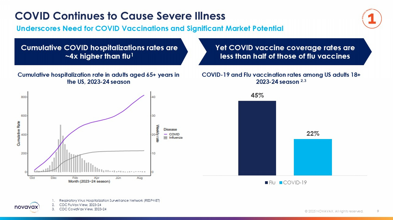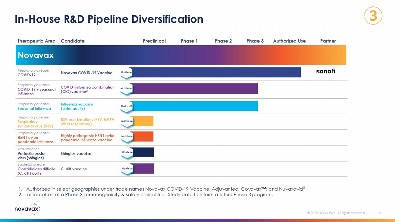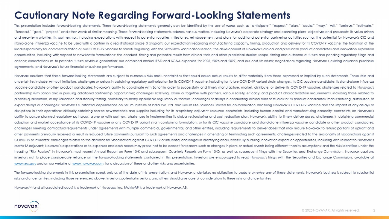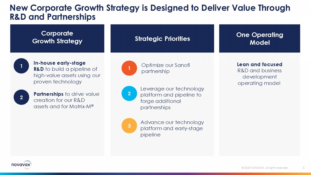 2 Cautionary Note Regarding Forward - Looking Statements © 2025 NOVAVAX. All rights reserved. This presentation includes forward - looking statements . These forward - looking statements generally can be identified by the use of words such as “anticipate,” “expect,” “plan,” “could,” “may,” “will,” “believe,” “estimate,” “forecast,” “goal,” “project,” and other words of similar meaning . These forward - looking statements address various matters including Novavax’s corporate strategy and operating plans, objectives and prospects ; its value drivers and near - term priorities ; its partnerships, including expectations with respect to potential royalties, milestones, reimbursement, and plans for additional potential partnering activities such as the potential for Novavax's CIC and stand - alone influenza vaccine to be used with a partner in a registrational phase 3 program ; our expectations regarding manufacturing capacity, timing, production and delivery for its COVID - 19 vaccine ; the transition of the lead responsibility for commercialization of our COVID - 19 vaccine to Sanofi beginning with the 2025 - 2026 vaccination season ; the development of Novavax's clinical and preclinical product candidates and innovation expansion opportunities, including with respect to new Matrix formulations ; the conduct, timing and potential results from clinical trials and other preclinical studies ; scope, timing and outcome of future and pending regulatory filings and actions ; expectations as to potential future revenue generation ; our combined annual R&D and SG&A expenses for 2025 , 2026 and 2027 , and our cost structure ; negotiations regarding Novavax’s existing advance purchase agreements ; and Novavax’s future financial or business performance . Novavax cautions that these forward - looking statements are subject to numerous risks and uncertainties that could cause actual results to differ materially from those expressed or implied by such statements . These risks and uncertainties include, without limitation, challenges or delays in obtaining regulatory authorization for its COVID - 19 vaccine, including for future COVID - 19 variant strain changes, its CIC vaccine candidate, its stand - alone influenza vaccine candidate or other product candidates ; Novavax’s ability to coordinate with Sanofi in order to successfully and timely manufacture, market, distribute, or deliver its COVID - 19 vaccine ; challenges related to Novavax’s partnership with Sanofi and in pursuing additional partnership opportunities ; challenges satisfying, alone or together with partners, various safety, efficacy, and product characterization requirements, including those related to process qualification, assay validation and stability testing, necessary to satisfy applicable regulatory authorities ; challenges or delays in conducting clinical trials or studies for its product candidates ; manufacturing, distribution or export delays or challenges ; Novavax’s substantial dependence on Serum Institute of India Pvt . Ltd . and Serum Life Sciences Limited for co - formulation and filling Novavax’s COVID - 19 vaccine and the impact of any delays or disruptions in their operations ; difficulty obtaining scarce raw materials and supplies including for its proprietary adjuvant ; resource constraints, including human capital and manufacturing capacity ; constraints on Novavax’s ability to pursue planned regulatory pathways, alone or with partners ; challenges in implementing its global restructuring and cost reduction plan ; Novavax’s ability to timely deliver doses ; challenges in obtaining commercial adoption and market acceptance of its COVID - 19 vaccine or any COVID - 19 variant strain containing formulation, or for its CIC vaccine candidate and stand - alone influenza vaccine candidate or other product candidates ; challenges meeting contractual requirements under agreements with multiple commercial, governmental, and other entities, including requirements to deliver doses that may require Novavax to refund portions of upfront and other payments previously received or result in reduced future payments pursuant to such agreements and challenges in amending or terminating such agreements ; challenges related to the seasonality of vaccinations against COVID - 19 or influenza ; challenges related to the demand for vaccinations against COVID - 19 or influenza ; challenges in identifying and successfully pursuing innovation expansion opportunities, including with respect to Novavax’s Matrix - M adjuvant ; Novavax’s expectations as to expenses and cash needs may prove not to be correct for reasons such as changes in plans or actual events being different than its assumptions ; and the risks identified under the heading “Risk Factors” in Novavax’s most recent Annual Report on Form 10 - K and subsequent Quarterly Reports on Form 10 - Q, as well as subsequent filings with the Securities and Exchange Commission . Novavax cautions investors not to place considerable reliance on the forward - looking statements contained in this presentation . Investors are encouraged to read Novavax’s filings with the Securities and Exchange Commission, available at www . sec . gov and on our website at www . novavax . com , for a discussion of these and other risks and uncertainties . The forward - looking statements in this presentation speak only as of the date of this presentation, and Novavax undertakes no obligation to update or revise any of these statements . Novavax's business is subject to substantial risks and uncertainties, including those referenced above . Investors, potential investors, and others should give careful consideration to these risks and uncertainties . Novavax TM (and all associated logos) is a trademark of Novavax, Inc . Matrix - M ® is a trademark of Novavax AB .