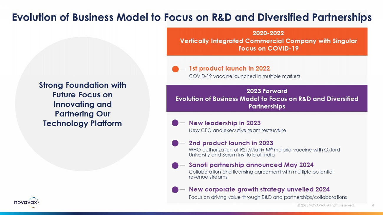 Corporate Growth Strategy New Corporate Growth Strategy is Designed to Deliver Value Through R&D and Partnerships In - house early - stage R&D to build a pipeline of high - value assets using our proven technology Partnerships to drive value creation for our R&D assets and for Matrix - M ® Strategic Priorities One Operating Model 1 2 1 2 3 Optimize our Sanofi partnership Leverage our technology platform and pipeline to forge additional partnerships Lean and focused R&D and business development operating model ​ 3 © 2025 NOVAVAX. All rights reserved. Advance our technology platform and early - stage pipeline