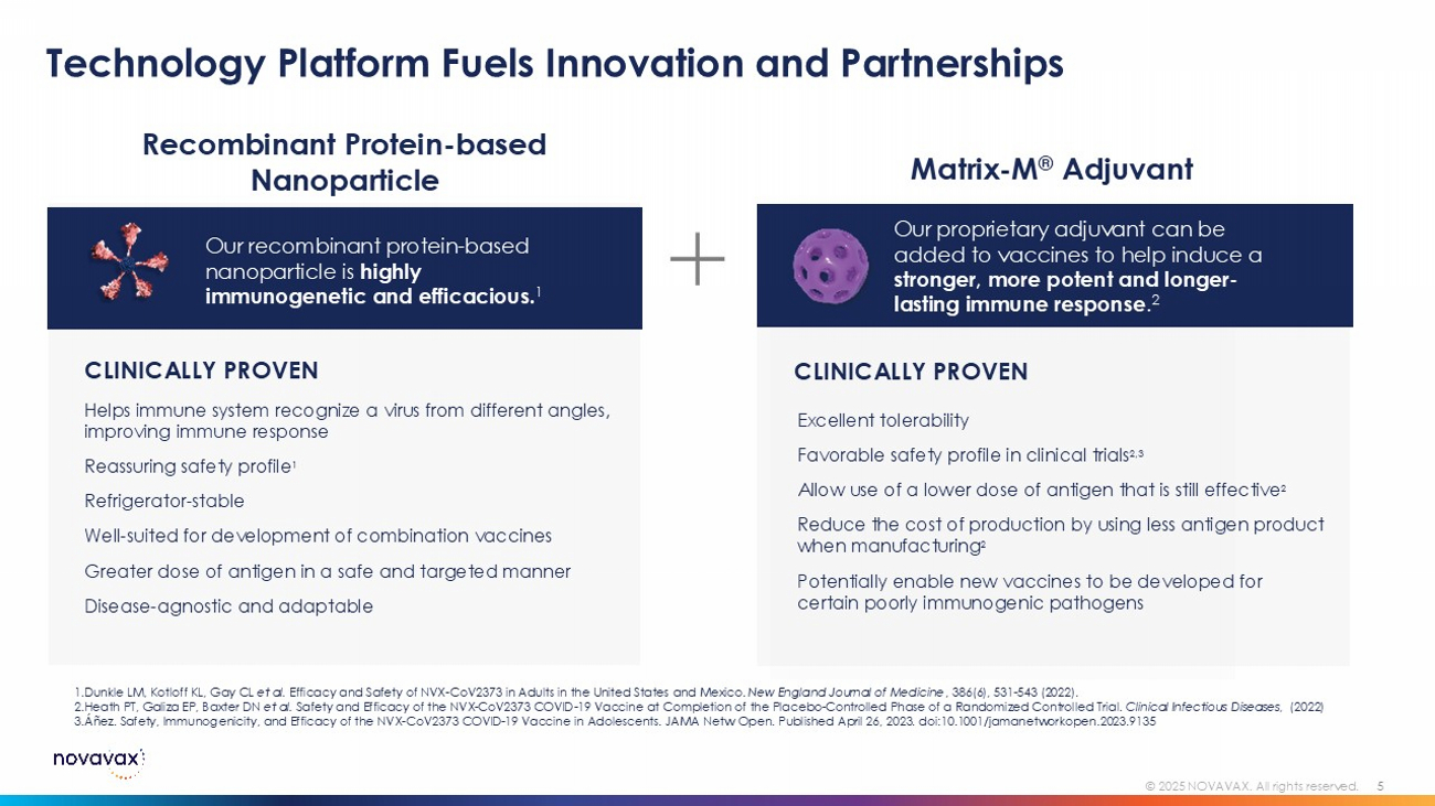 4 1st product launch in 2022 WHO authorization of R21/Matrix - M ® malaria vaccine with Oxford University and Serum Institute of India New corporate growth strategy unveiled 2024 2023 Forward Evolution of Business Model to Focus on R&D and Diversified Partnerships COVID - 19 vaccine launched in multiple markets ​ New ​ leadership in 2023 ​ New CEO and ​​ executive team restructure ​​ ​​ 2nd product launch in 2023 Sanofi partnership ​ announced May 2024 Collaboration and licensing agreement with multiple potential revenue streams Focus on driving value through R&D and partnerships/collaborations ​ Strong Foundation with Future Focus on Innovating and Partnering Our Technology Platform 2020 - 2022 Vertically Integrated Commercial Company with Singular Focus on COVID - 19 © 2025 NOVAVAX. All rights reserved. Evolution of Business Model to Focus on R&D and Diversified Partnerships