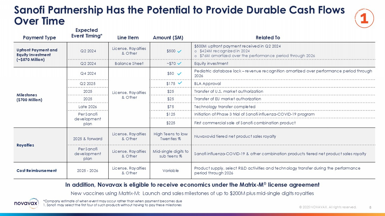 Sanofi P artnership has the Potential to Drive Growth Through Multiple Revenue Streams 7 License to co - commercialize Novavax’s current stand - alone adjuvanted COVID - 19 vaccine worldwide* License to Novavax’s adjuvanted COVID - 19 vaccine for use in combination with Sanofi’s flu and other vaccines Non - exclusive license to use the Matrix - M ® adjuvant in vaccine products Sanofi took a minority (<5%) equity investment in Novavax * Except in countries with existing Advance Purchase Agreements and in India, Japan, and South Korea where Novavax has existi ng partnership agreements Future partnerships will further validate our technology platform and have the potential to provide significant opportunity to drive value creation, increase access to our technology and benefit global health © 2025 NOVAVAX. All rights reserved.