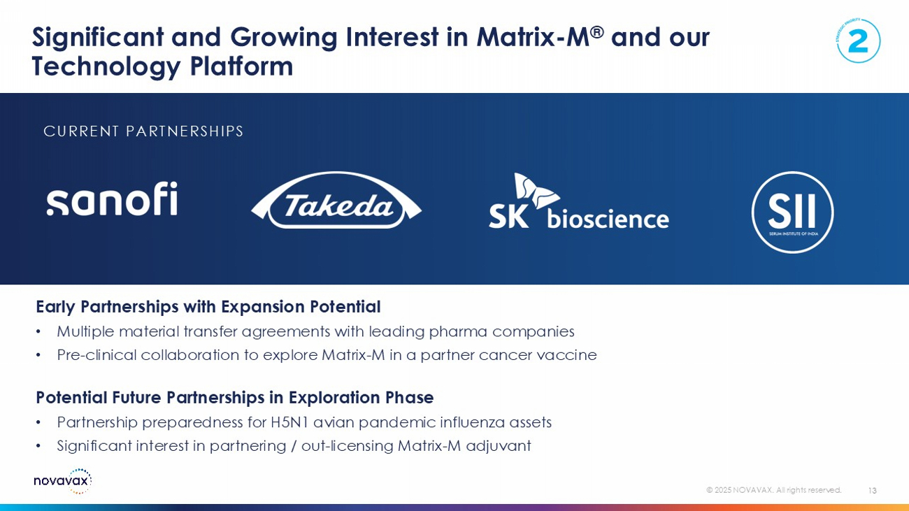Partner Authorized Use Phase 3 Phase 2 Phase 1 Preclinical Candidate Therapeutic Area Developed by partners leveraging Novavax technology R21/Matrix - M ® adjuvant 1 Parasitic diseases Malaria RIV3 (FLUBLOK) - NCT06695130 2 Respiratory diseases COVID - 19 + seasonal influenza TIV - HD (FLUZONE High - Dose) NCT06695117 2 Respiratory diseases COVID - 19 + seasonal influenza Licensed rights to develop additional combination vaccines using our COVID - 19 vaccine Respiratory diseases Additional Vaccines Licensed rights to develop vaccines using our Matrix - M adjuvant Vaccines using our Matrix - M adjuvant Matrix - M 1. Commercialized by Serum Institute of India; Granted prequalification by the WHO and distributed by UNICEF to endemic countrie s i n Africa. 2. Granted Fast Track designation in the U.S. Phase 1/2 Matrix - M Phase 1/2 Matrix - M Value Generation Through Existing Partnerships 12 © 2025 NOVAVAX. All rights reserved.
