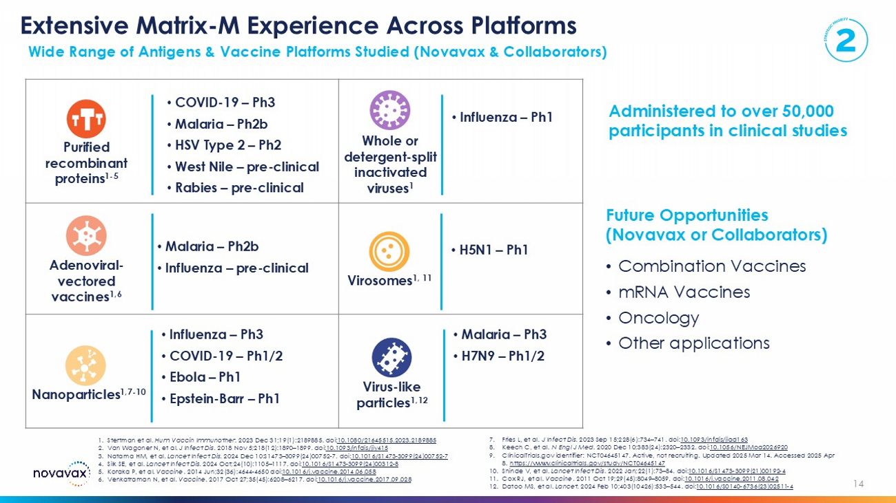 Significant and Growing Interest in Matrix - M ® and our Technology Platform Early Partnerships with Expansion Potential • Multiple m aterial transfer agreements with leading pharma companies • Pre - clinical collaboration to explore Matrix - M in a partner cancer vaccine CURRENT PARTNERSHIPS © 2025 NOVAVAX. All rights reserved. 13 Potential Future Partnerships in Exploration Phase • Partnership preparedness for H5N1 avian pandemic influenza assets • Significant interest in partnering / out - licensing Matrix - M adjuvant