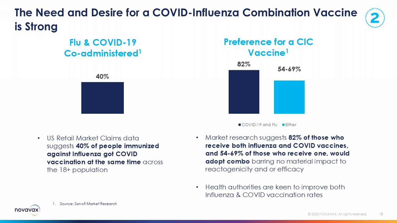Administered to over 50,000 participants in clinical studies Wide Range of Antigens & Vaccine Platforms Studied (Novavax & Collaborators) 14 © 2025 NOVAVAX. All rights reserved. CONFIDENTIAL AND PROPRIETARY. 1. Stertman et al. Hum Vaccin Immunother . 2023 Dec 31;19(1):2189885. doi: 10.1080/21645515.2023.2189885 2. Van Wagoner N, et al. J Infect Dis . 2018 Nov 5;218(12):1890 – 1899. doi: 10.1093/ infdis /jiy415 3. Natama HM, et al. Lancet Infect Dis . 2024 Dec 10:S1473 – 3099(24)00752 - 7. doi: 10.1016/S1473 - 3099(24)00752 - 7 4. Silk SE, et al. Lancet Infect Dis . 2024 Oct;24(10):1105 – 1117. doi: 10.1016/S1473 - 3099(24)00312 - 8 5. Koraka P, et al. Vaccine . 2014 Jun;32(36):4644 - 4650 doi: 10.1016/j.vaccine.2014.06.058 6. Venkatraman N, et al. Vaccine . 2017 Oct 27;35(45):6208 – 6217. doi: 10.1016/j.vaccine.2017.09.028 Extensive Matrix - M Experience Across Platforms Future Opportunities (Novavax or Collaborators) • Combination Vaccines • mRNA Vaccines • Oncology • Other applications Purified recombinant proteins 1 - 5 • COVID - 19 – Ph3 • Malaria – Ph2b • HSV Type 2 – Ph2 • West Nile – pre - clinical • Rabies – pre - clinical Whole or detergent - split inactivated viruses 1 • Influenza – Ph1 Nanoparticles 1,7 - 10 • Influenza – Ph3 • COVID - 19 – Ph1/2 • Ebola – Ph1 • Epstein - Barr – Ph1 Virus - like particles 1,12 • Malaria – Ph3 • H7N9 – Ph1/2 Adenoviral - vectored vaccines 1,6 • Malaria – Ph2b • Influenza – pre - clinical Virosomes 1, 11 • H5N1 – Ph1 7. Fries L, et al. J Infect Dis . 2023 Sep 15;228(6):734 – 741. doi: 10.1093/ infdis /jiad163 8. Keech C, et al. N Engl J Med . 2020 Dec 10;383(24):2320 – 2332. doi: 10.1056/NEJMoa2026920 9. ClinicalTrials.gov identifier: NCT04645147. Active, not recruiting. Updated 2025 Mar 14. Accessed 2025 Apr 8. https://www.clinicaltrials.gov/study/NCT04645147 10. Shinde V, et al. Lancet Infect Dis . 2022 Jan;22(1):73 – 84. doi: 10.1016/S1473 - 3099(21)00192 - 4 11. Cox RJ, et al. Vaccine . 2011 Oct 19;29(45):8049 – 80 59. doi: 10.1016/j.vaccine.2011.08.042 12. Datoo MS, et al. Lancet . 2024 Feb 10;403(10426):533 – 544. doi: 10.1016/S0140 - 6736(23)02511 - 4