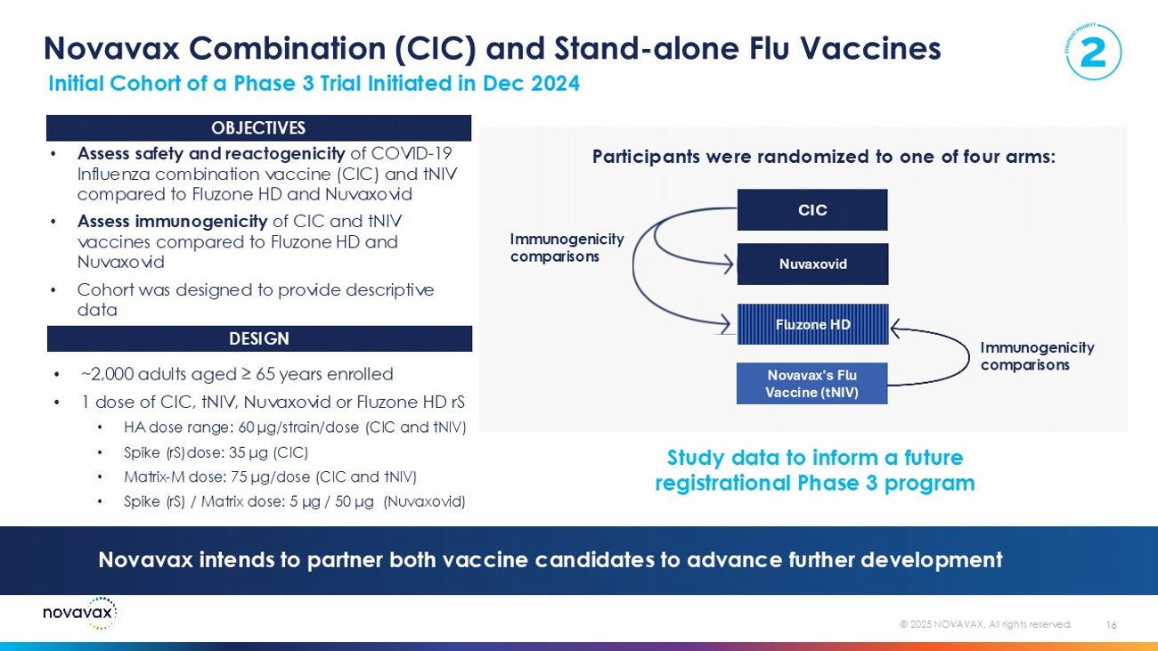 The Need and Desire for a COVID - Influenza Combination Vaccine is Strong 15 © 2025 NOVAVAX. All rights reserved. 1. Source: Sanofi Market Research 40% Co-administered 82% 54 - 69% COVID-19 and Flu Either • US Retail Market Claims data suggests 40% of people immunized against Influenza got COVID vaccination at the same time across the 18+ population • Market research suggests 82% of those who receive both influenza and COVID vaccines, and 54 - 69% of those who receive one, would adopt combo barring no material impact to reactogenicity and or efficacy • Health authorities are keen to improve both Influenza & COVID vaccination rates Flu & COVID - 19 Co - administered 1 Preference for a CIC Vaccine 1